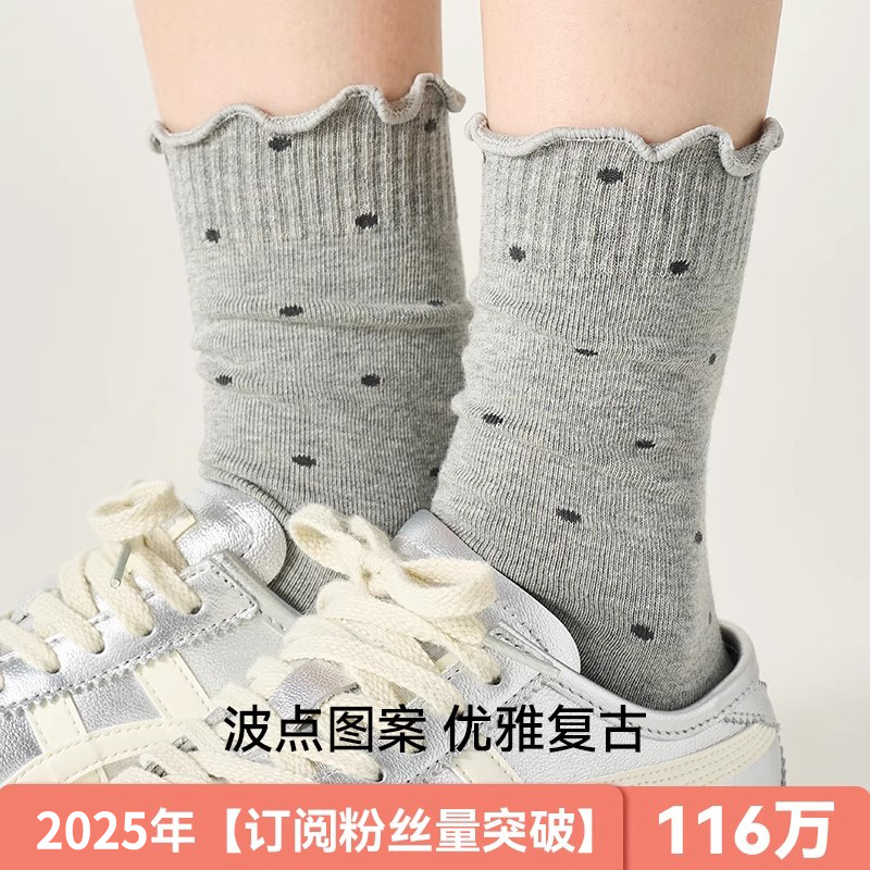 波点袜子女2025新款 夏秋纯棉中筒袜日系花边长袜女可爱堆堆袜 爆款