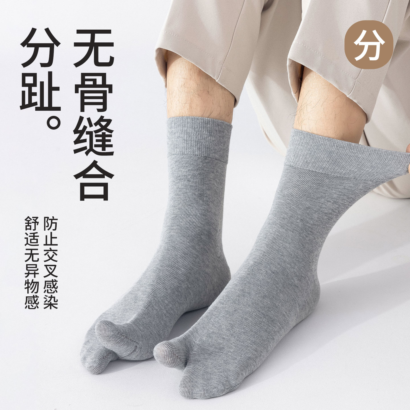 二趾袜子男纯棉中筒袜春秋款 10A级抗菌吸汗防臭分趾袜白色脚趾袜