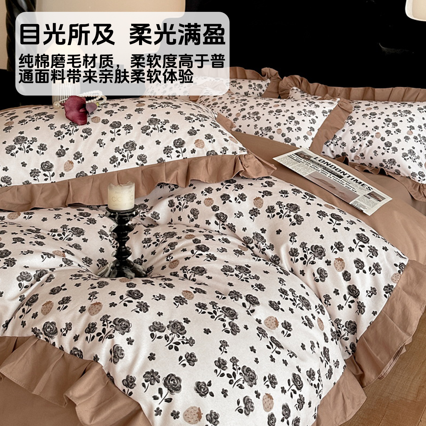 复古花卉加厚全棉磨毛四件套裸睡级法式 花边纯棉被套床单保暖秋冬
