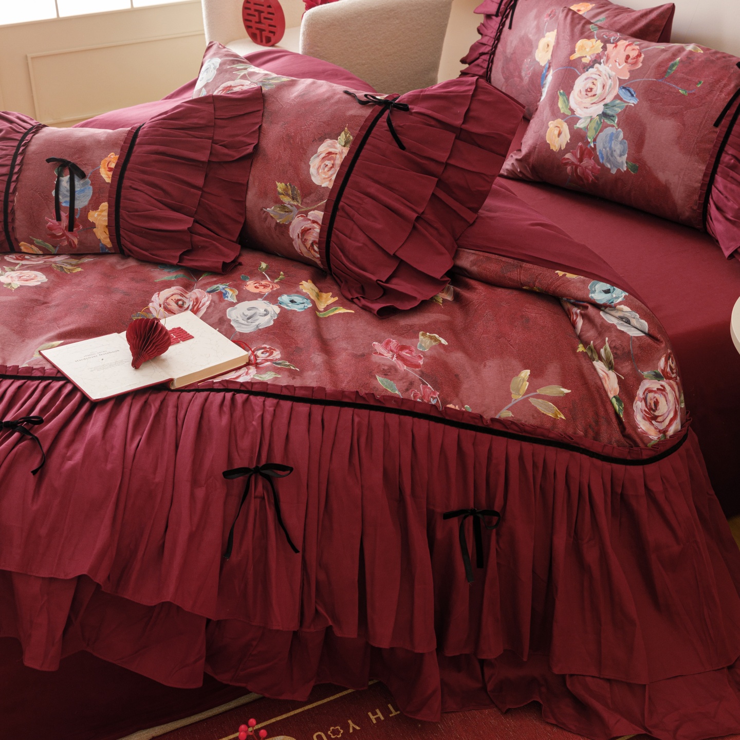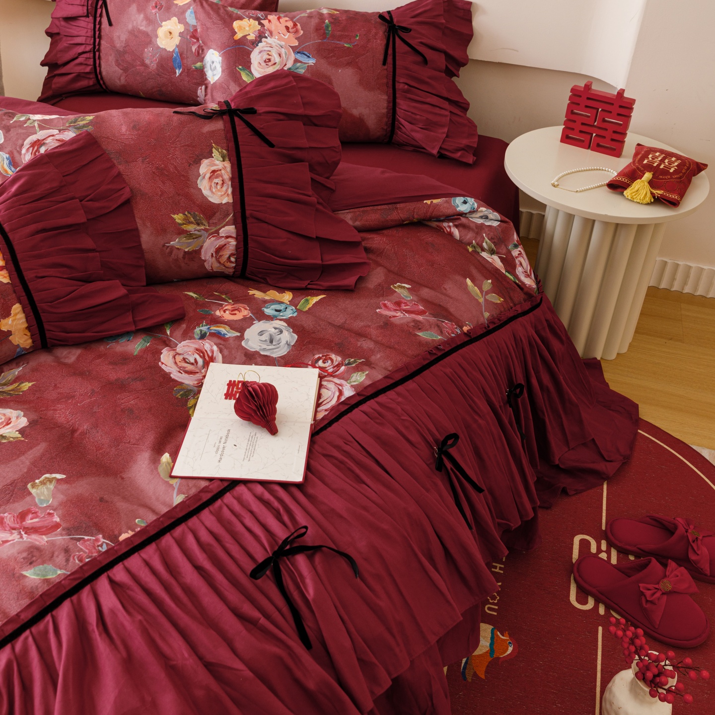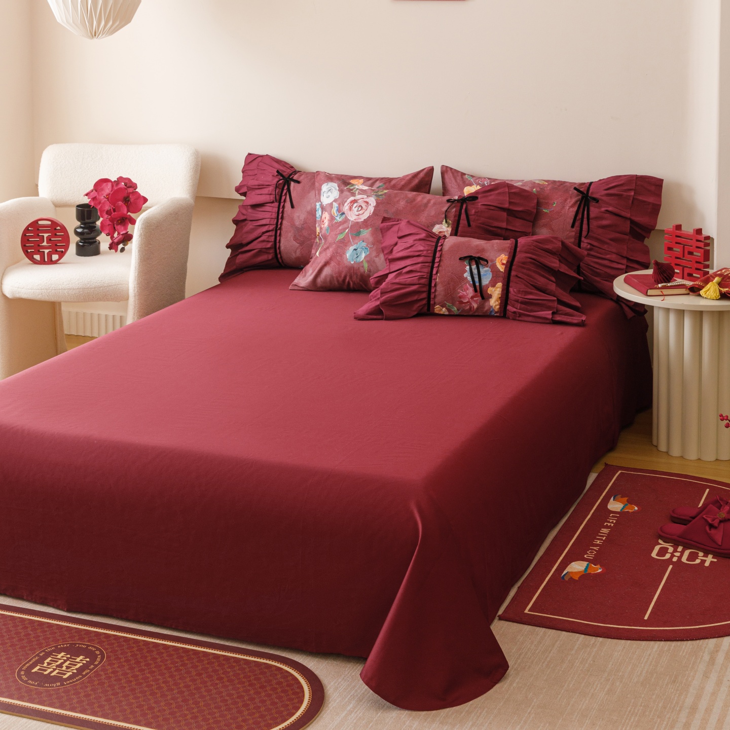 水星家纺全棉婚庆四件套60支长绒棉喜庆红色套件新中式 婚嫁床品