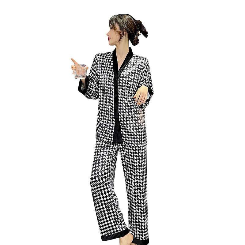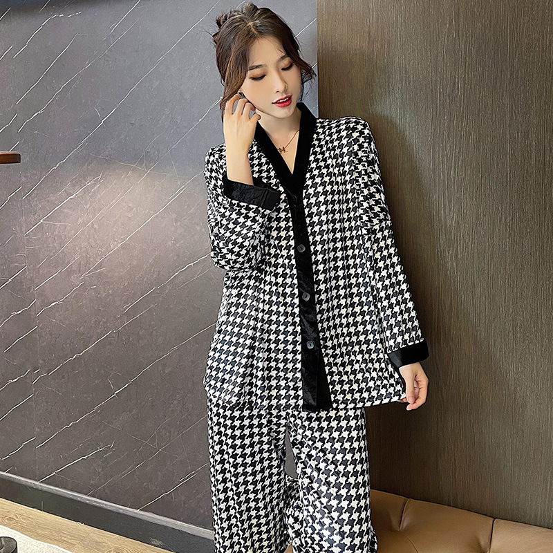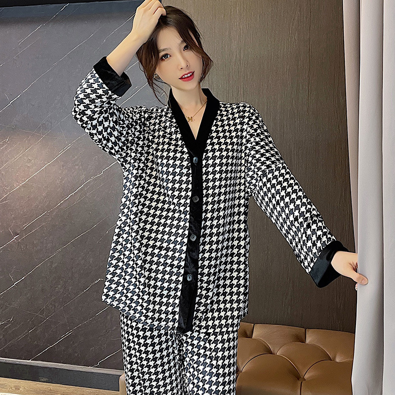 韩版 24豹纹印花潮流金丝绒睡衣套装 千鸟格长袖 家居服 长裤 V领开衫