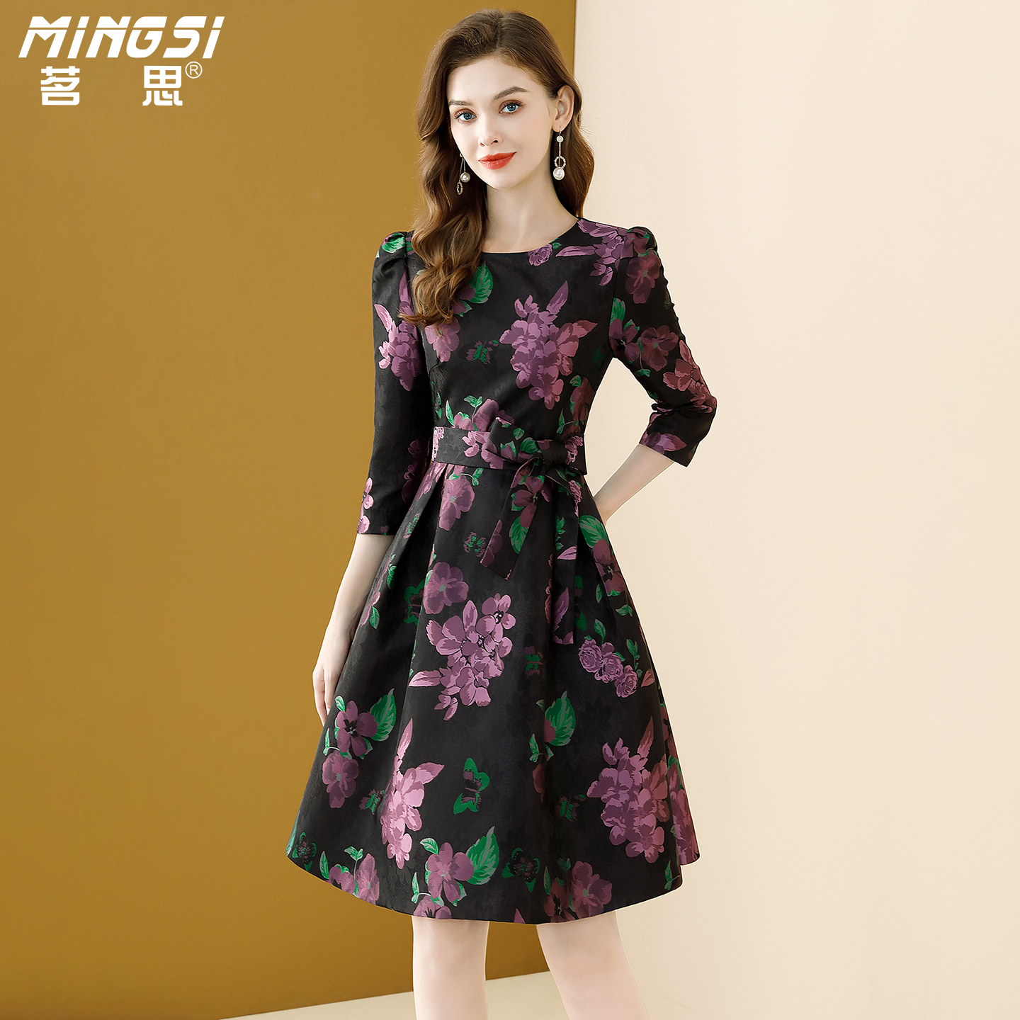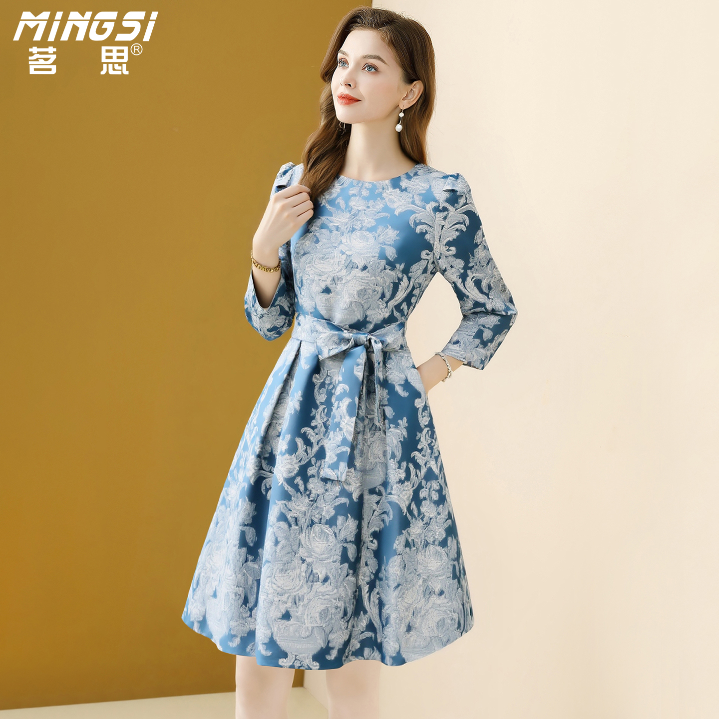 气质收腰显瘦裙子 七分袖 茗思高级感刺绣提花连衣裙女2025秋季 新款