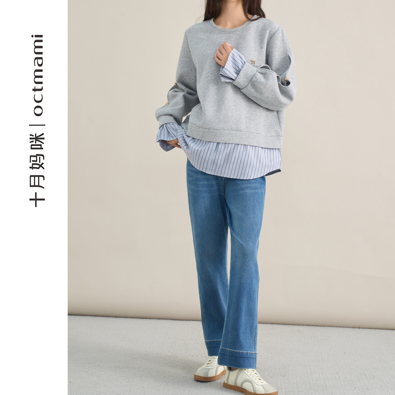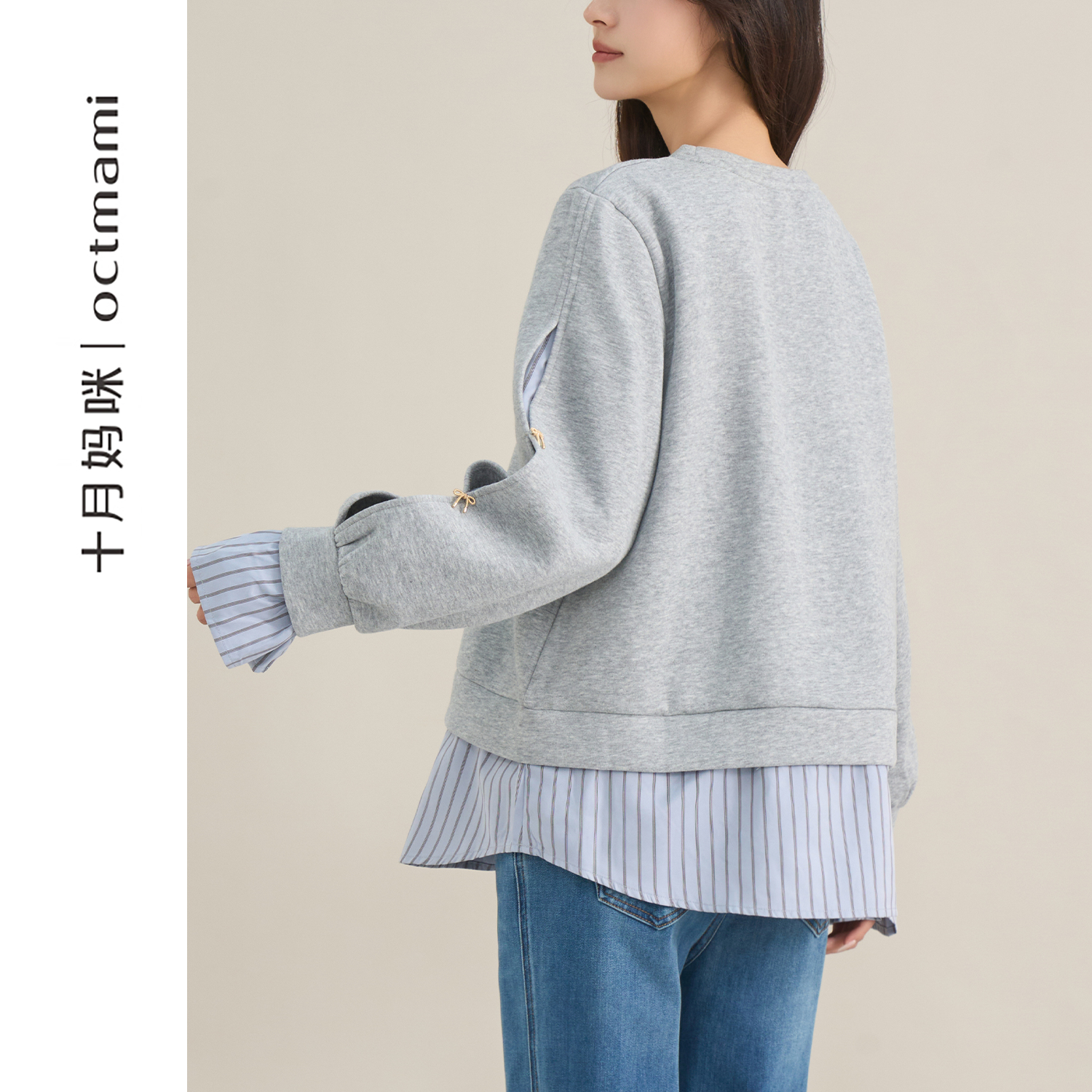 外穿宽松上衣秋装 十月妈咪孕妇金属蝴蝶结假两件卫衣2025新款 秋季