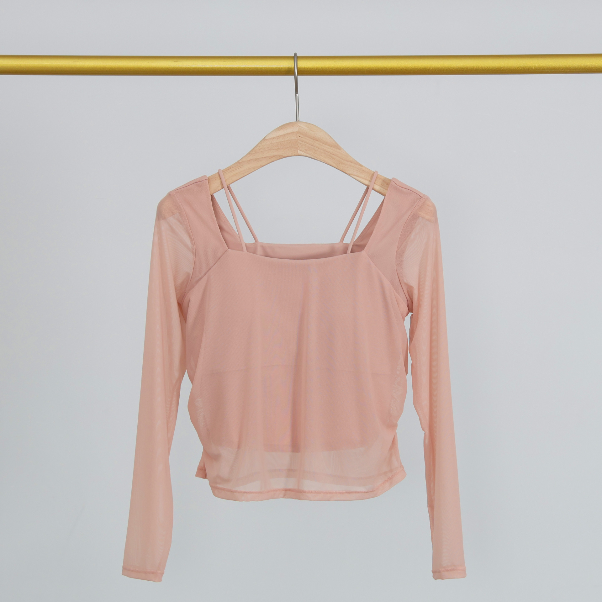 网纱固定胸垫瑜伽服女长袖 普拉提训练服高颜值运动健身服 上衣春季