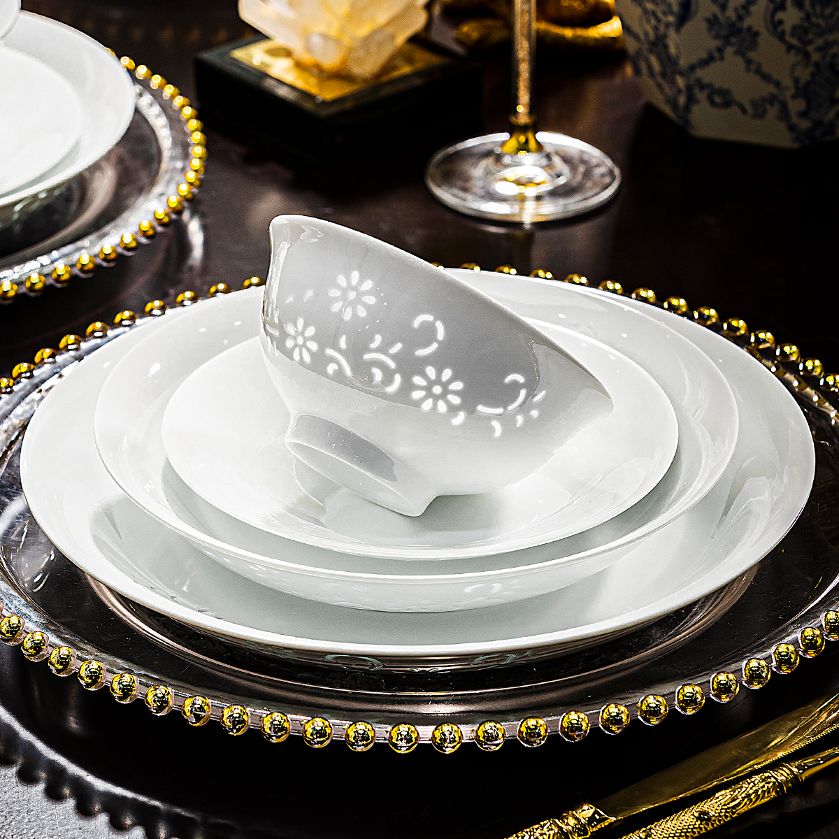 景德镇玲珑瓷餐具高档碗碟套装 家用盘子纯白碗盘碗筷乔迁新居新款