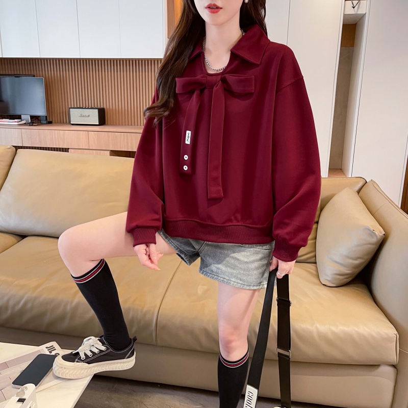 polo领上衣外套 宽松薄款 蝴蝶结设计感酒红色卫衣女春秋季 2025新款