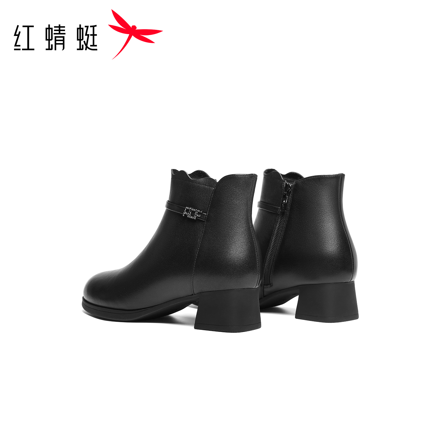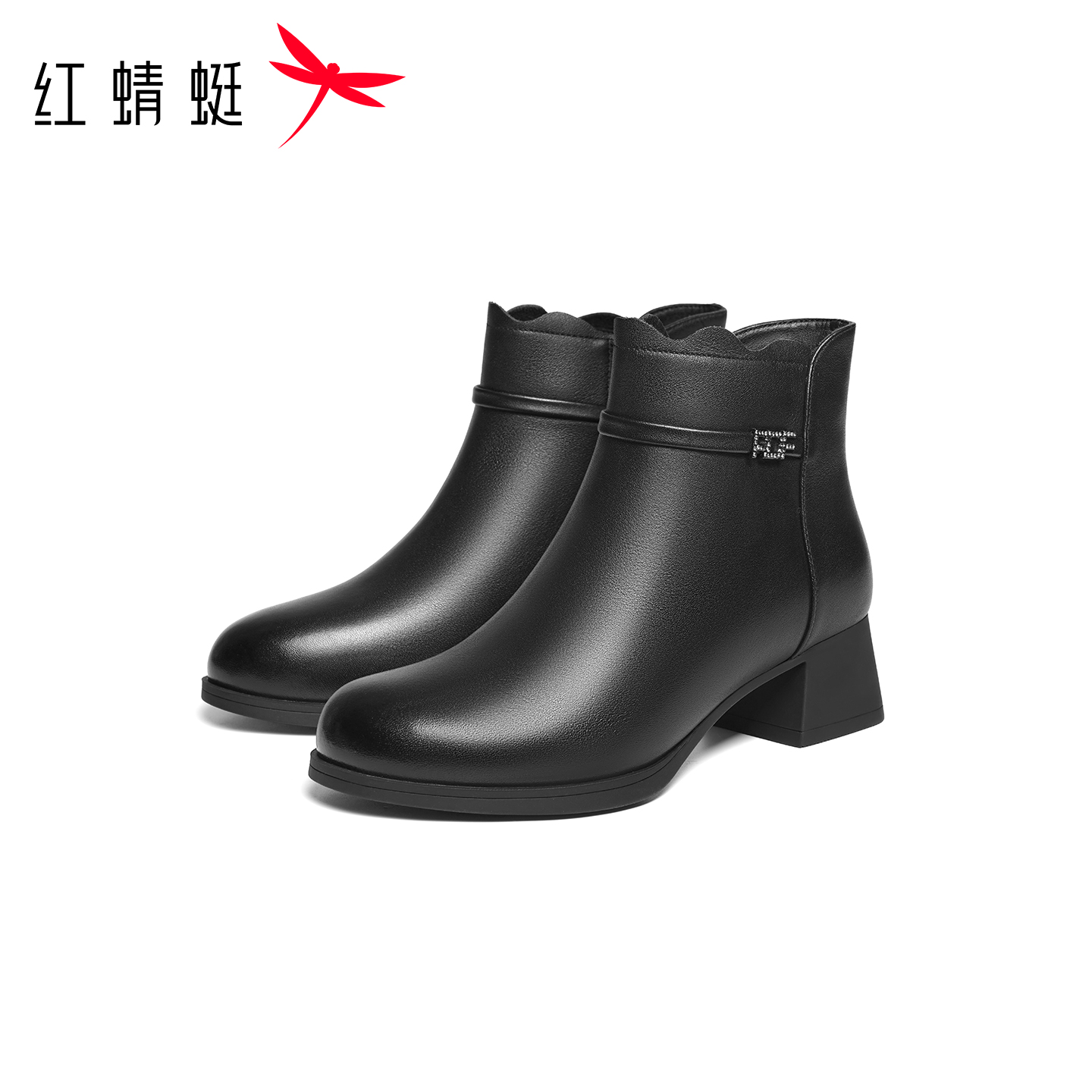 加绒保暖妈妈靴子 粗跟羊毛皮鞋 红蜻蜓真皮短靴女2025秋冬新款 女鞋