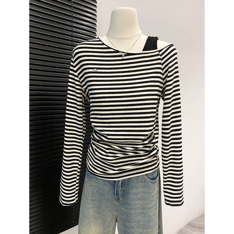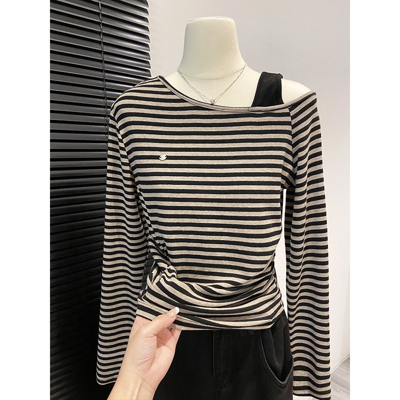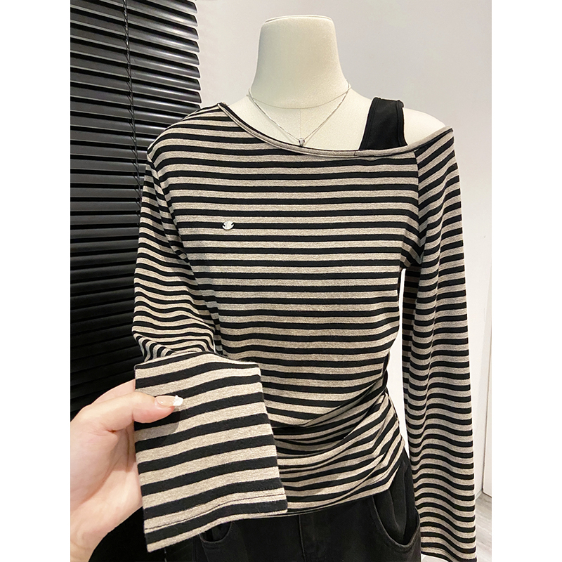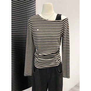 内搭打底衫 t恤女2025小众修身 露肩上衣 复古条纹斜肩长袖 早秋新款