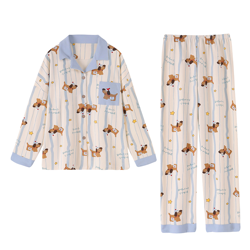 带胸垫家居服套装 卡通可爱小狗长袖 2025新款 猫人情侣睡衣女春秋款