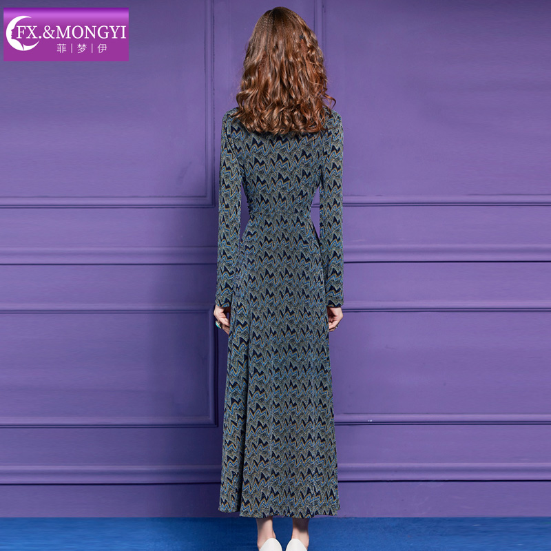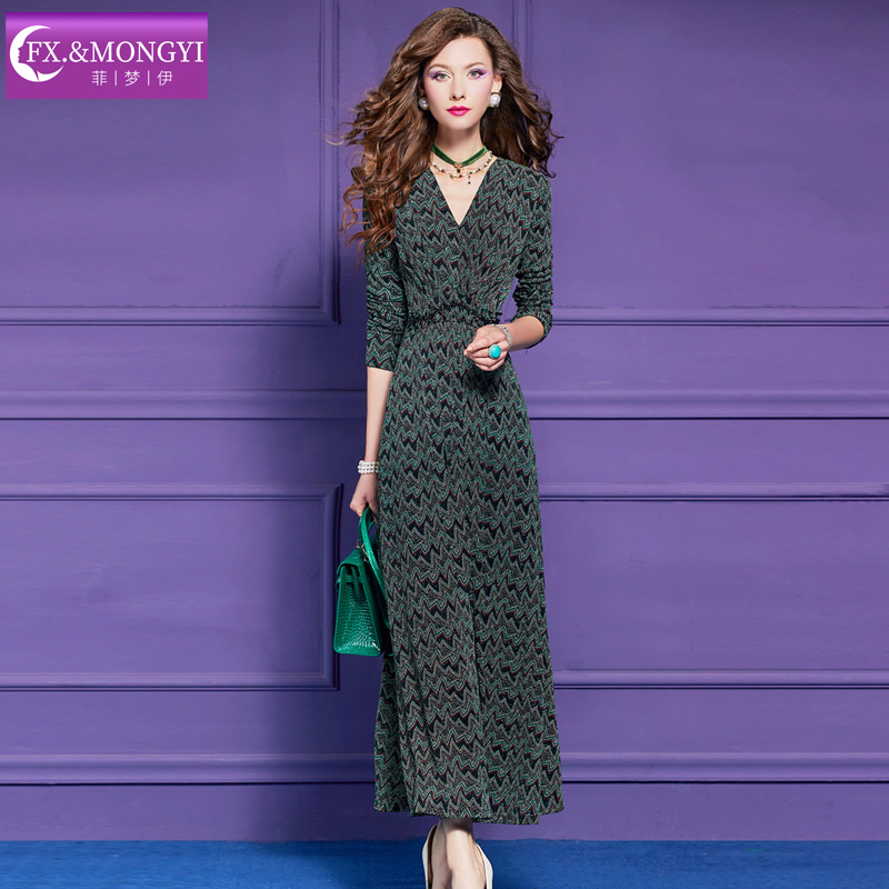 菲梦伊印花连衣裙女长袖 巨好看绝美复古收腰气质V领打底长裙 秋装