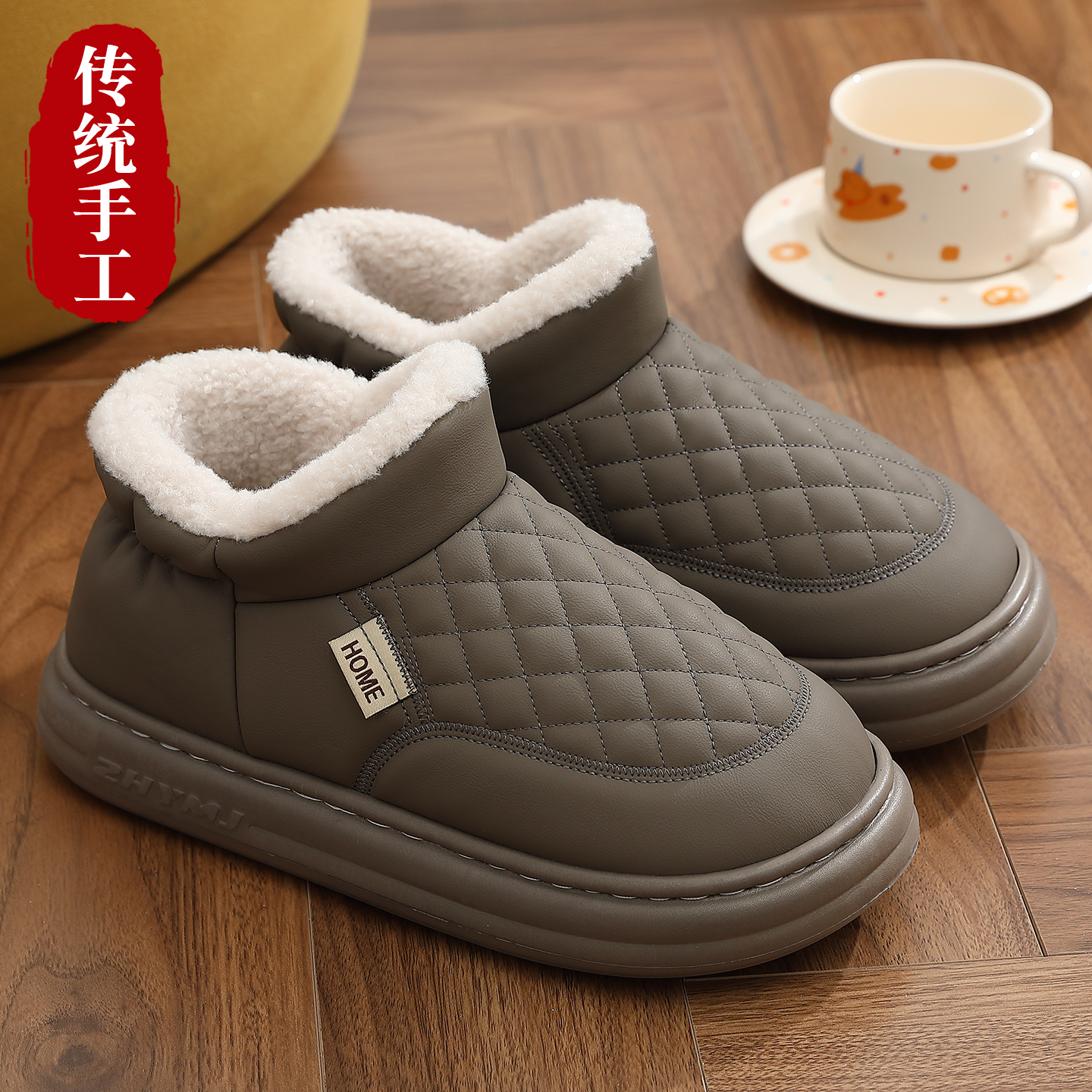 棉拖鞋 男款 冬季 室内家居PU防水保暖毛绒棉鞋 包跟2025新款 老人男士