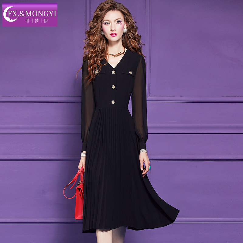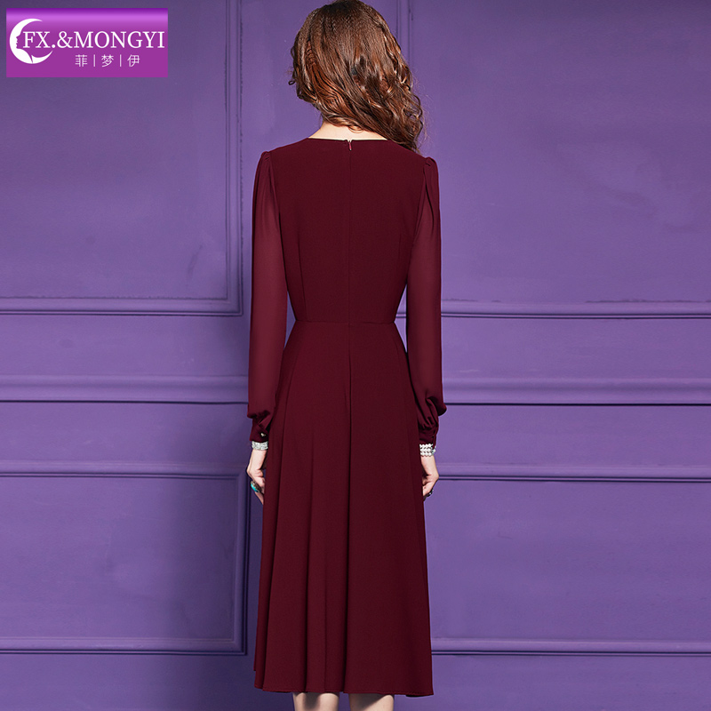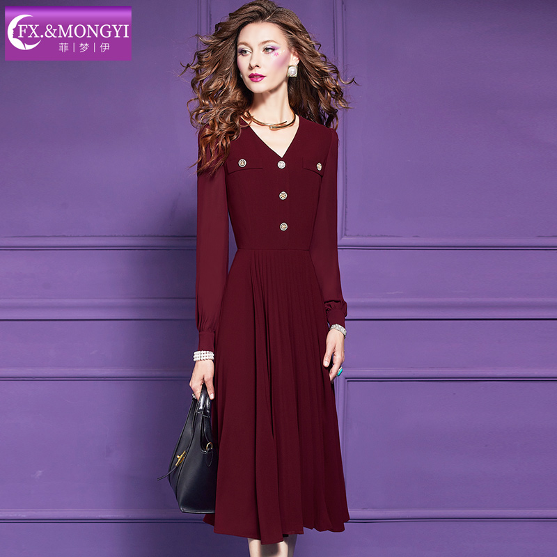 法式 新款 名媛淑女收腰V领中长裙 秋装 菲梦伊原创红色连衣裙女长袖
