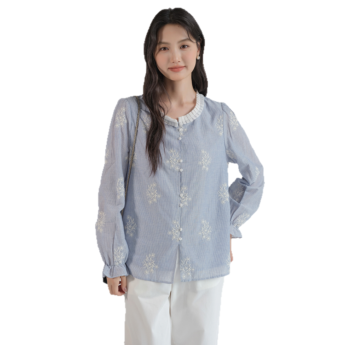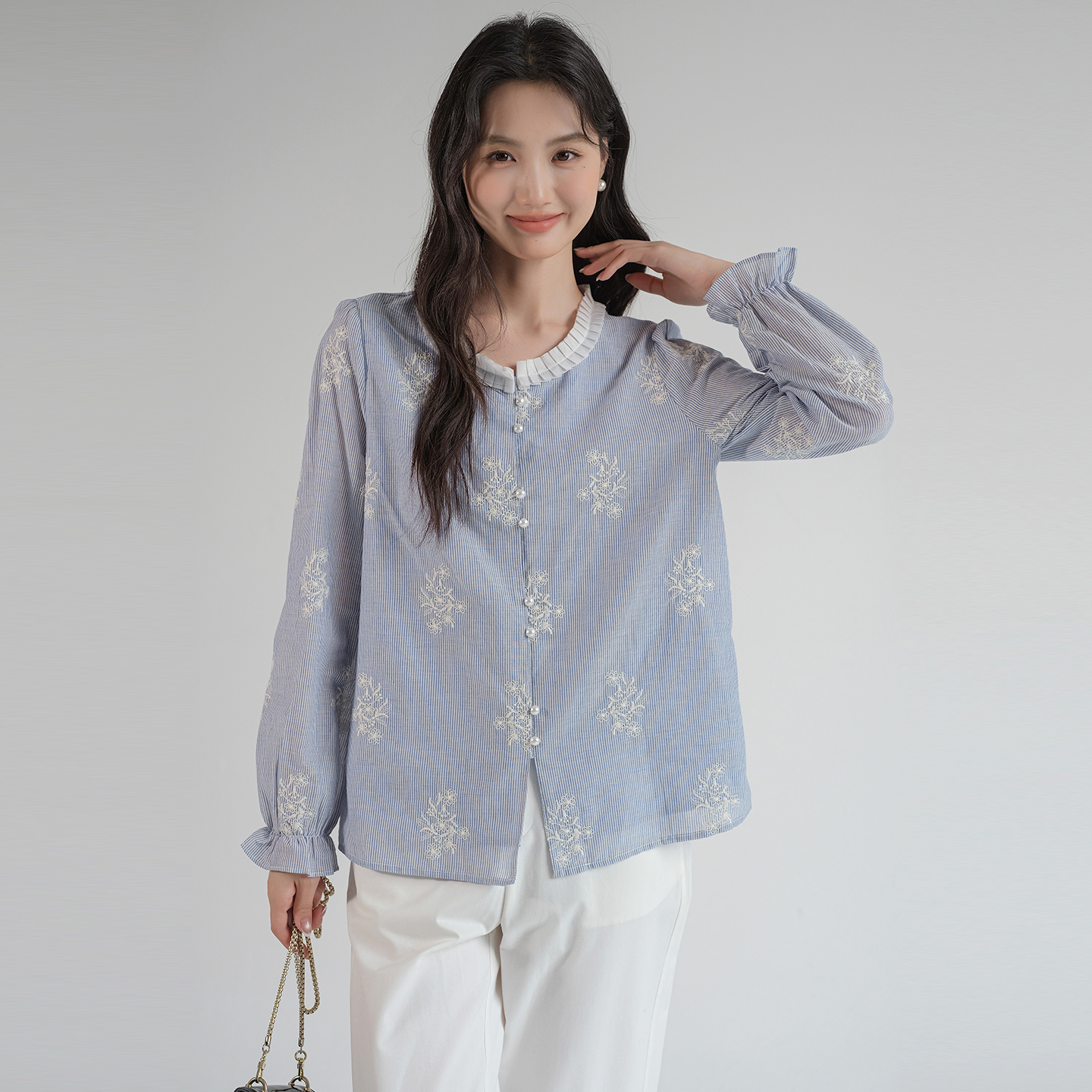 新款 2025秋装 蓝若水大码 花边圆领条纹衬衣 高级感刺绣钉珠衬衫