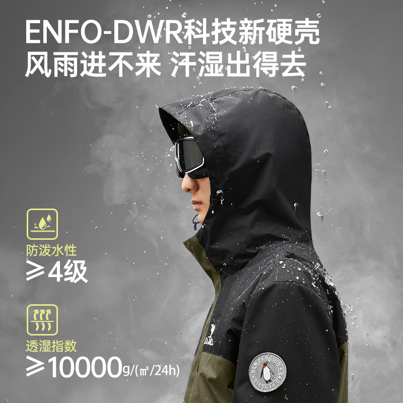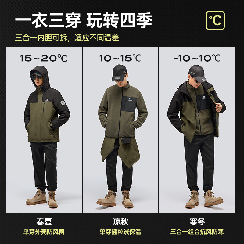 骆驼户外三合一夹克风衣外套男秋冬加绒可拆卸抓绒黑色防水登山服