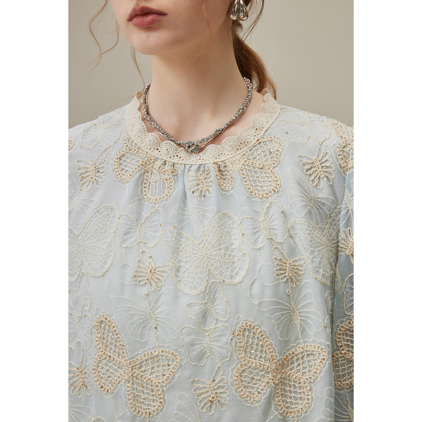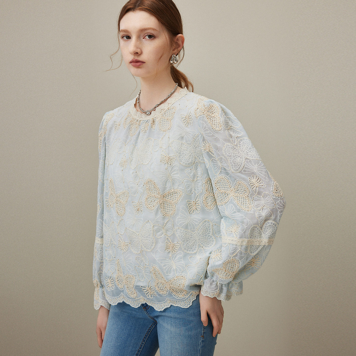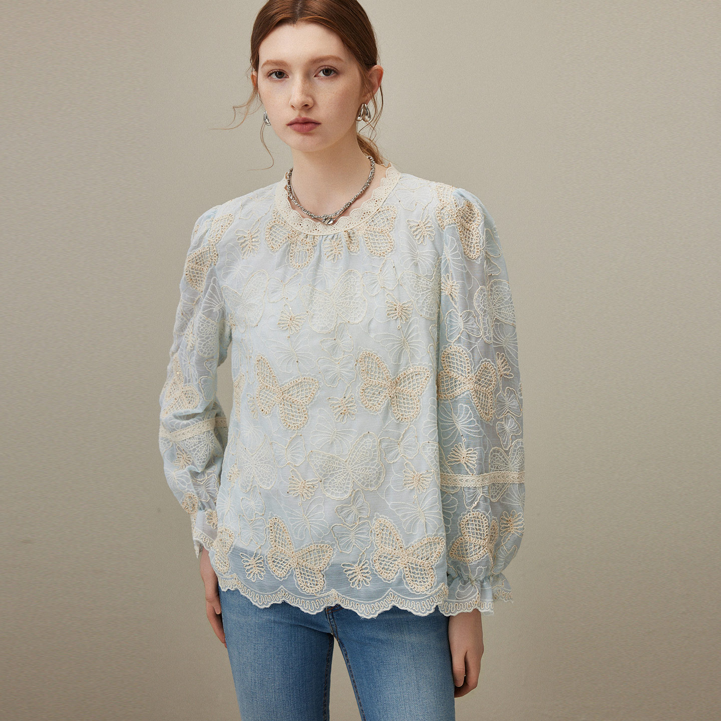 新款 dfvc法式 女2025年秋季 衬衫 花边领宽松上衣 重工蝴蝶绣花长袖