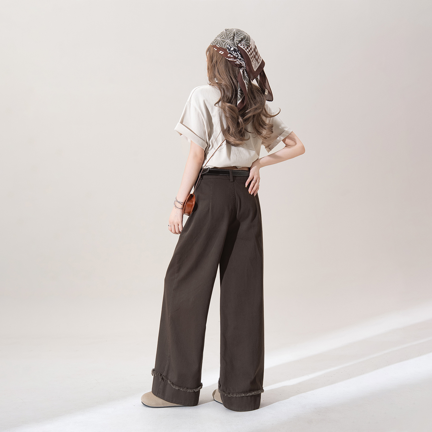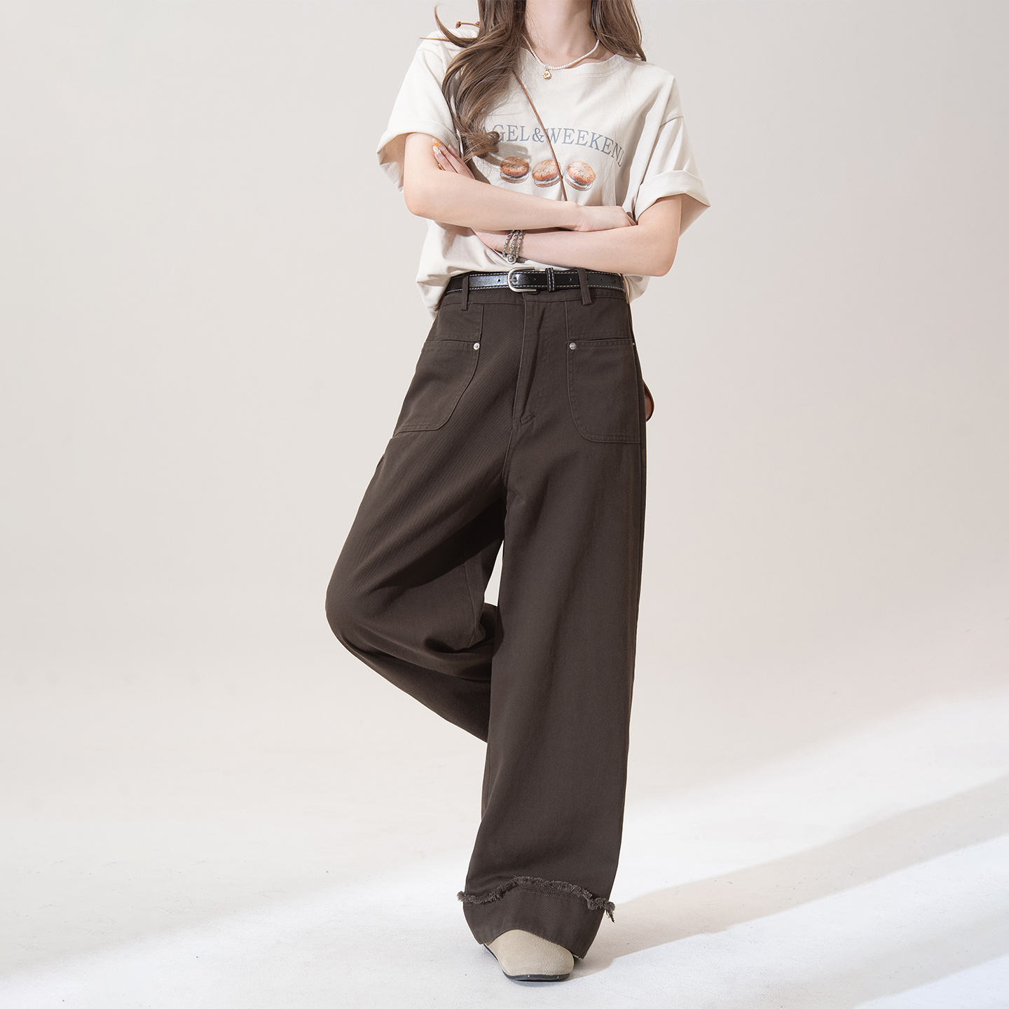 小个子双口袋设计感毛边牛仔裤 新款 女秋季 咖色宽松垂感直筒休闲裤