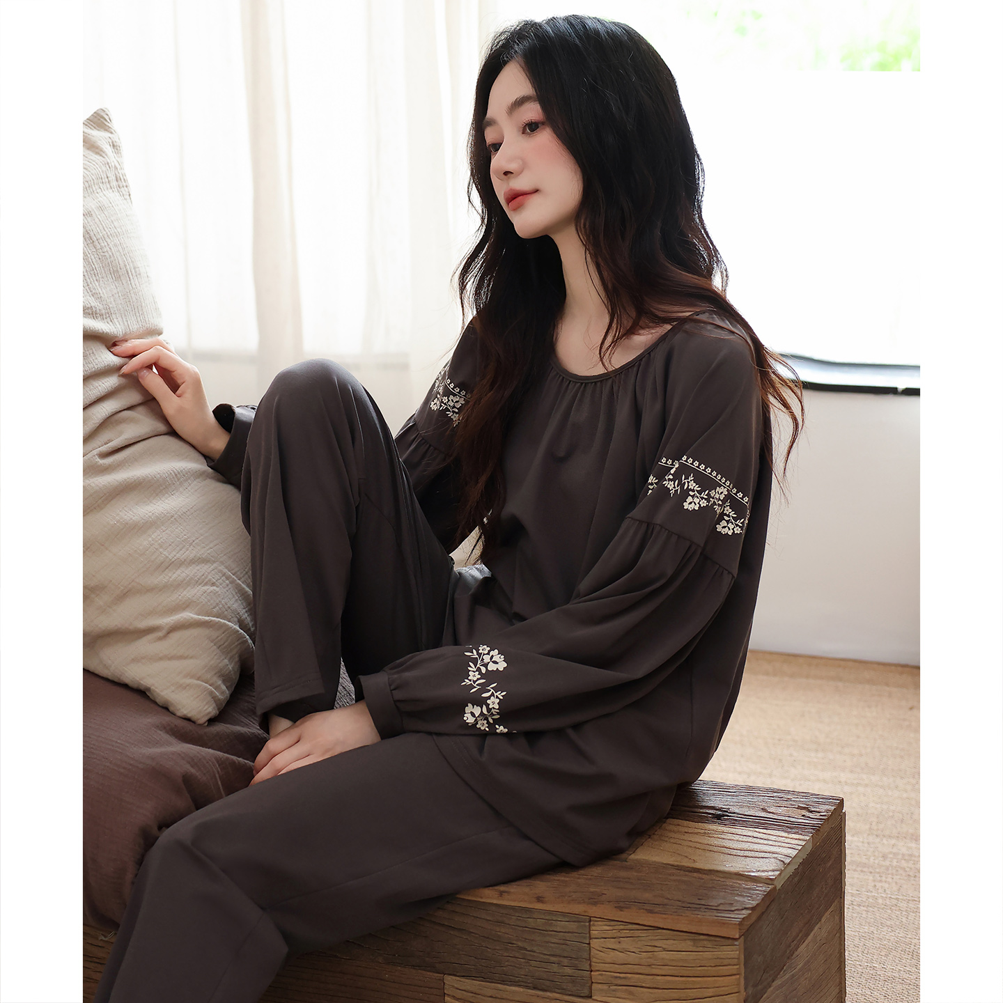 全棉薄款 秋季 中年妈妈高级感家居服 纯棉长袖 带胸垫睡衣女士春秋款