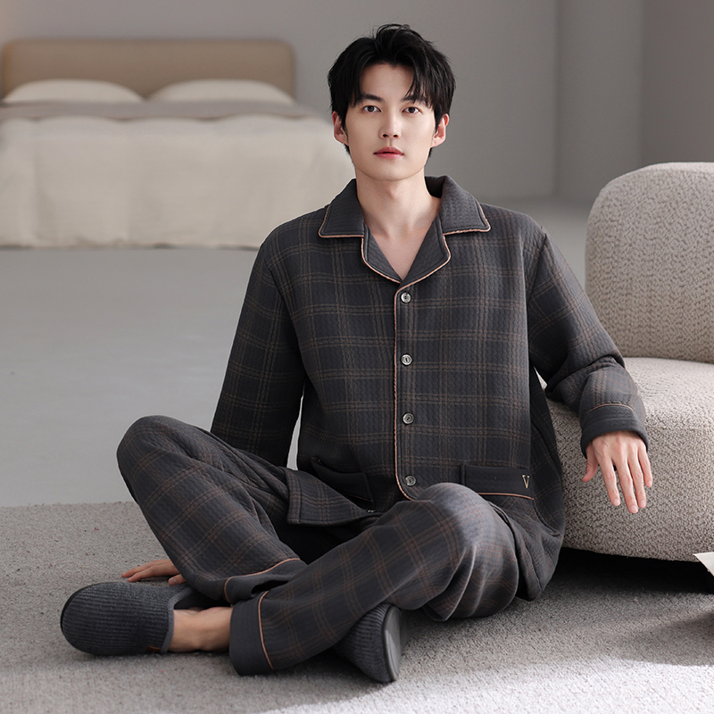家居服春秋 青年宽松加大码 夹棉睡衣男空气棉夹层秋冬纯棉长袖 套装