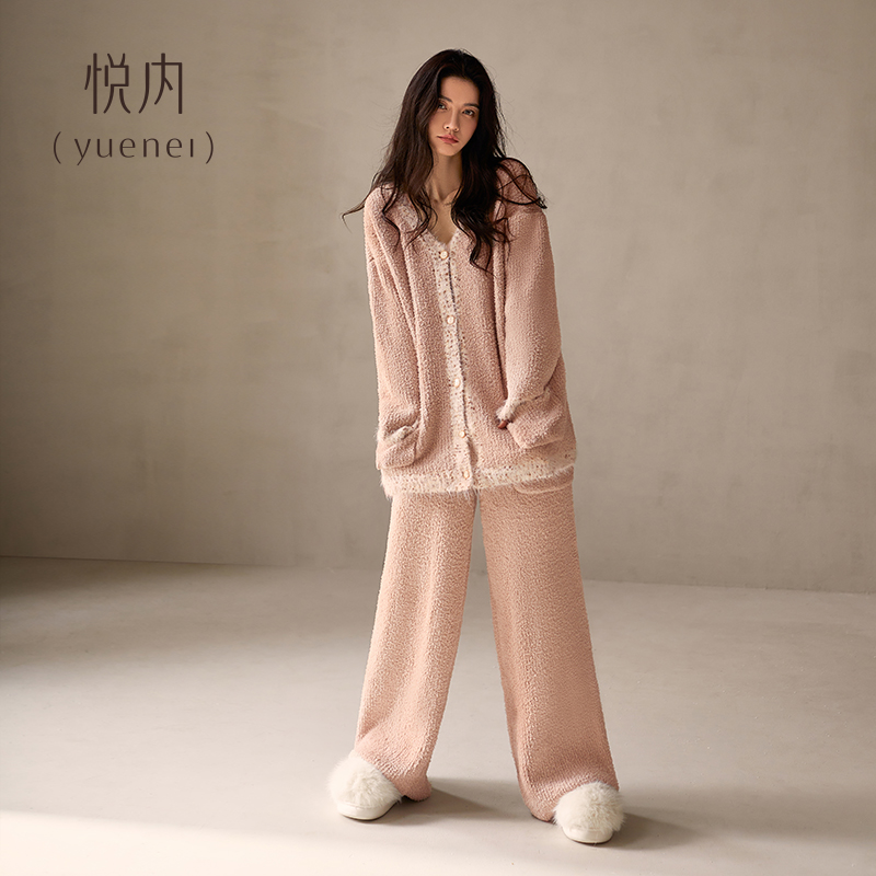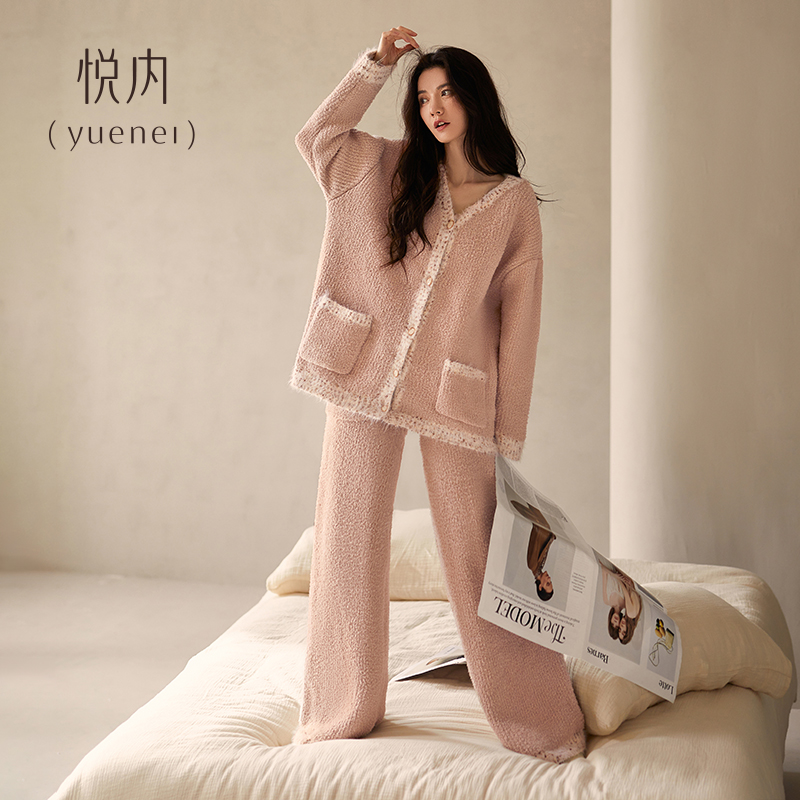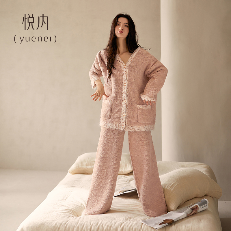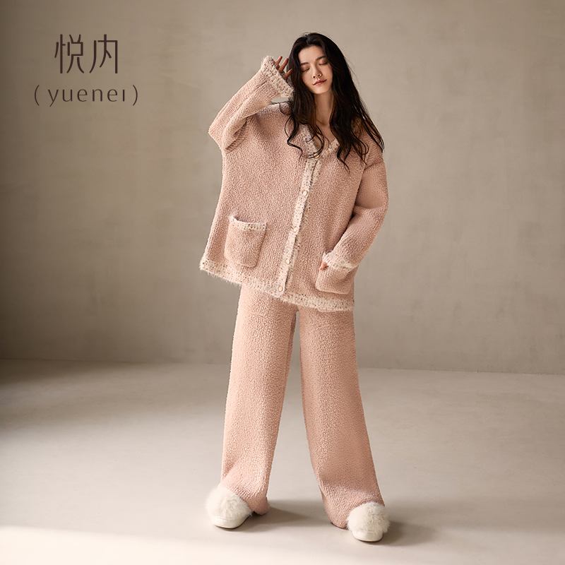 家居服粉色小香风 珊瑚绒保暖加绒加厚款 悦内半边绒睡衣女款 秋冬季