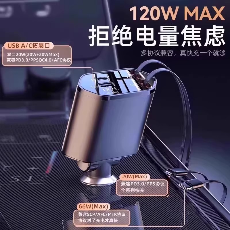 汽车车载快充手机充电器点烟器隐藏伸缩线一拖三120W车充转换插头