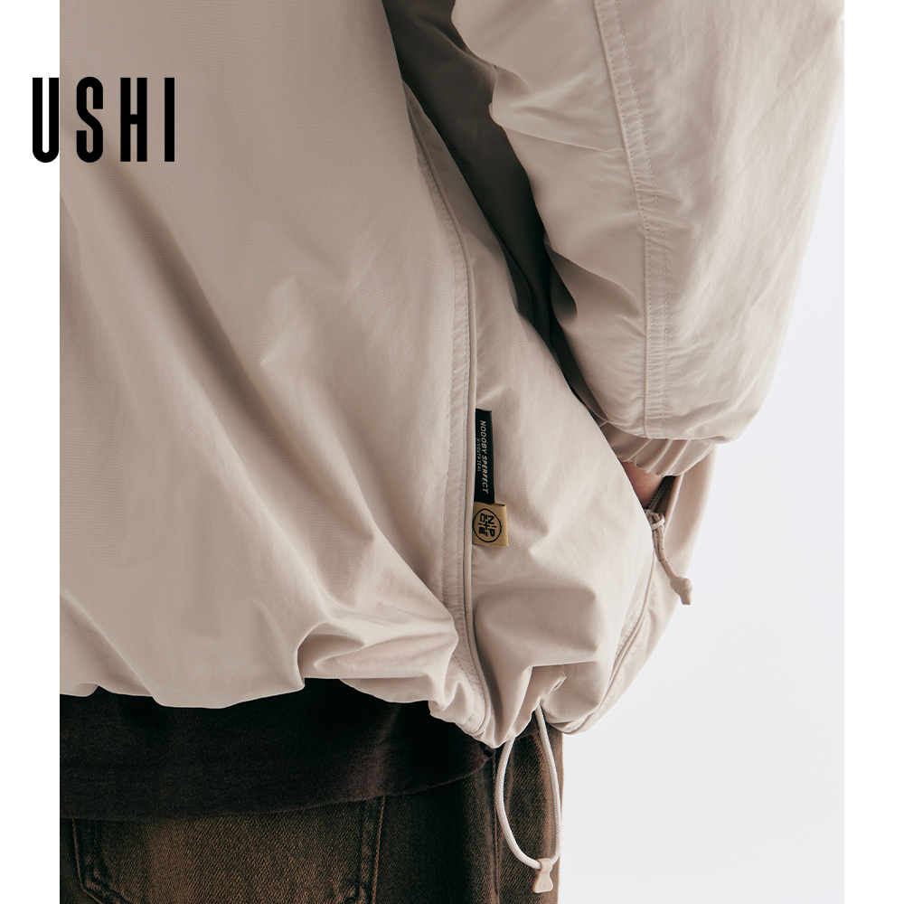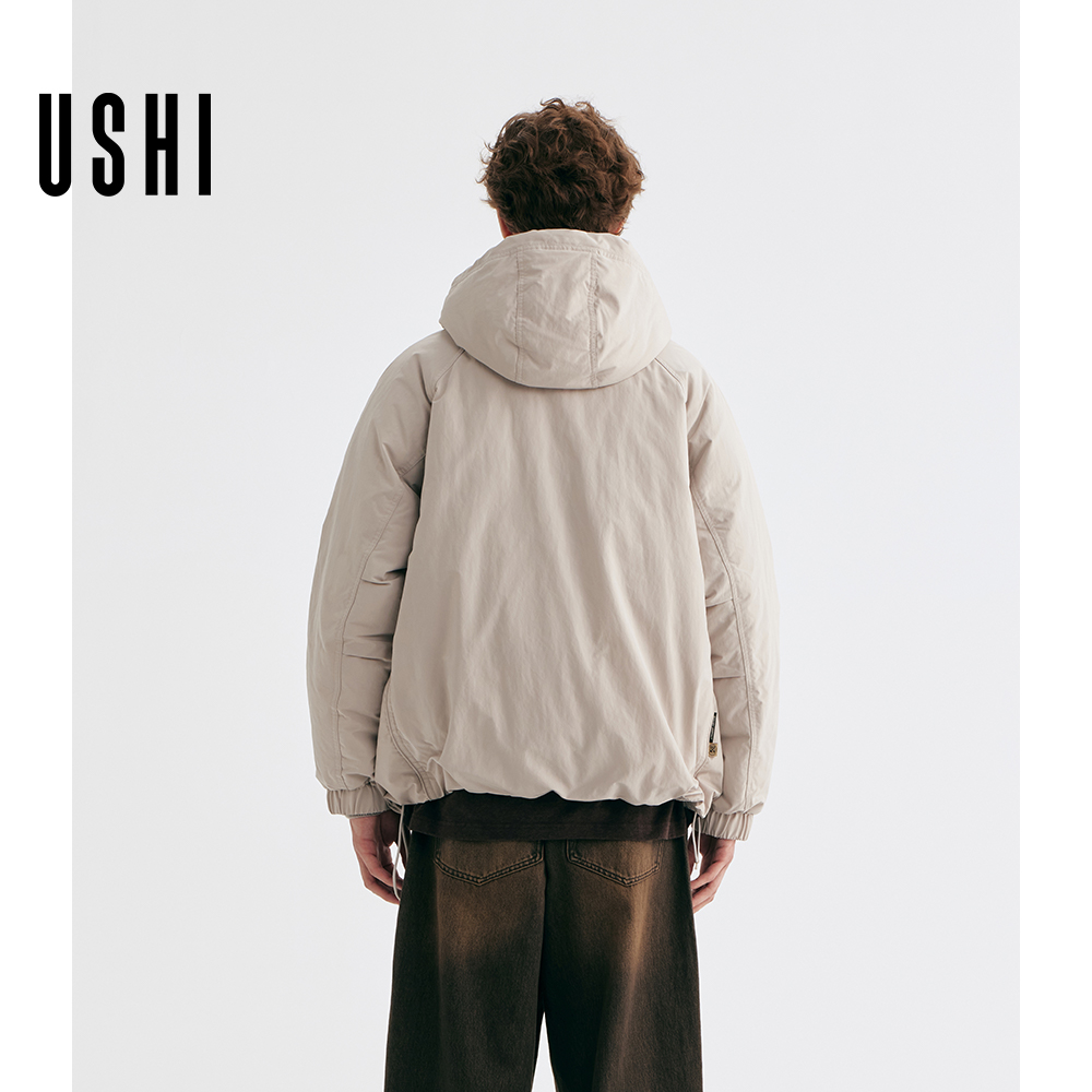USHI悠时 浅灰色连帽羽绒服简约抽绳设计休闲舒适外套 男士