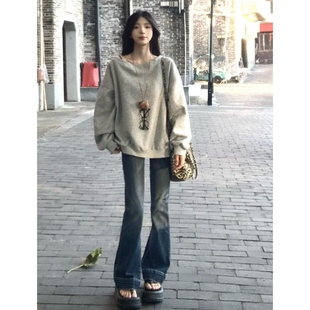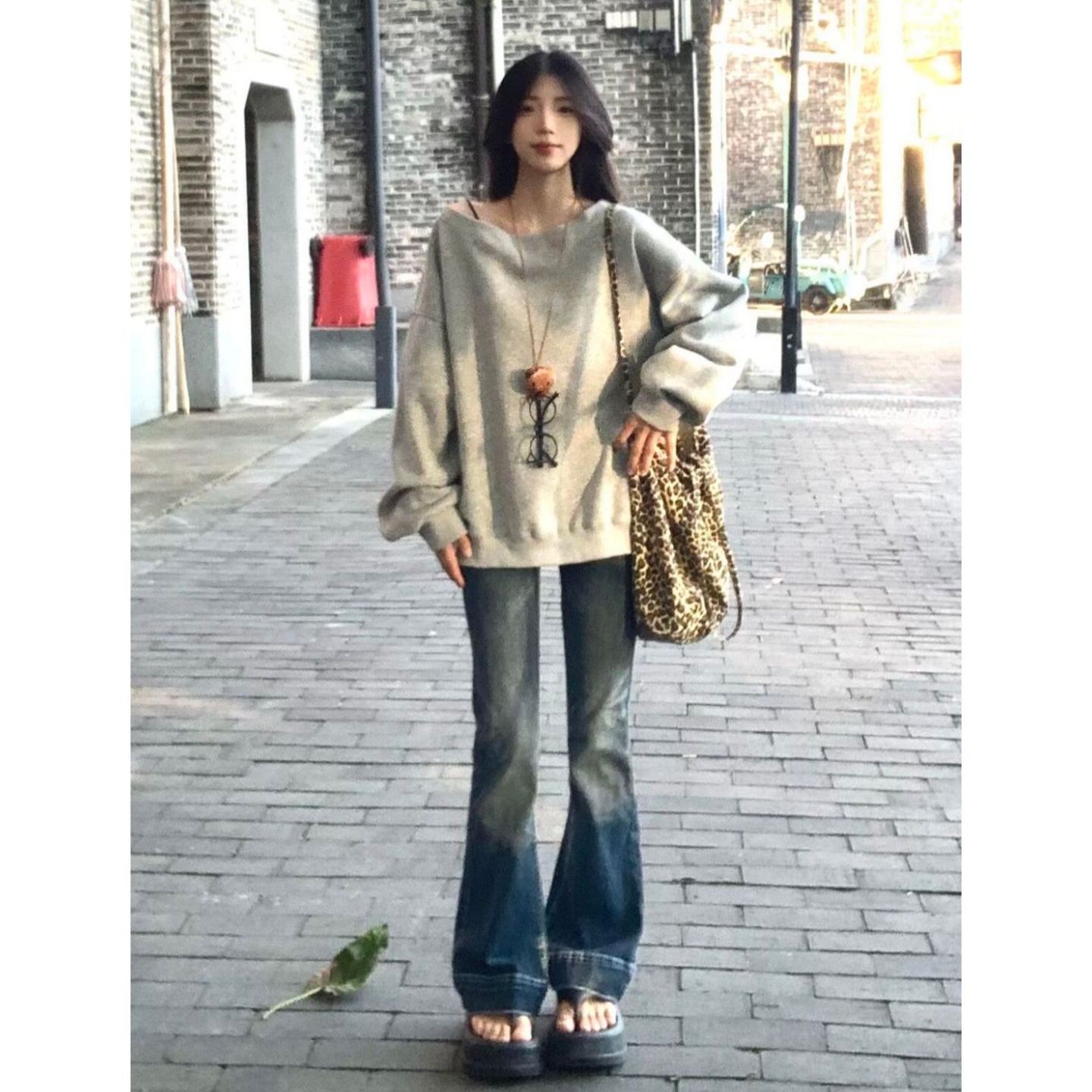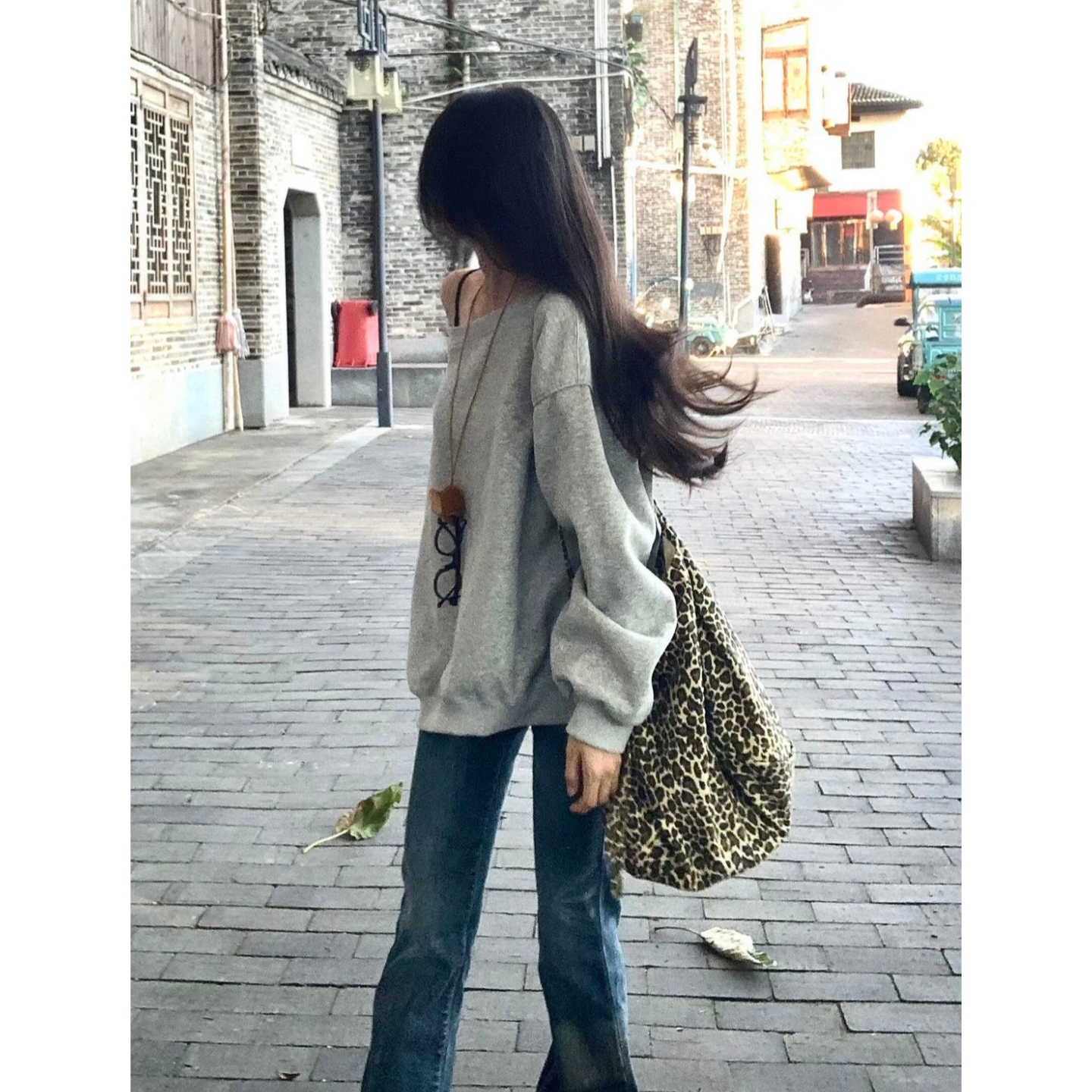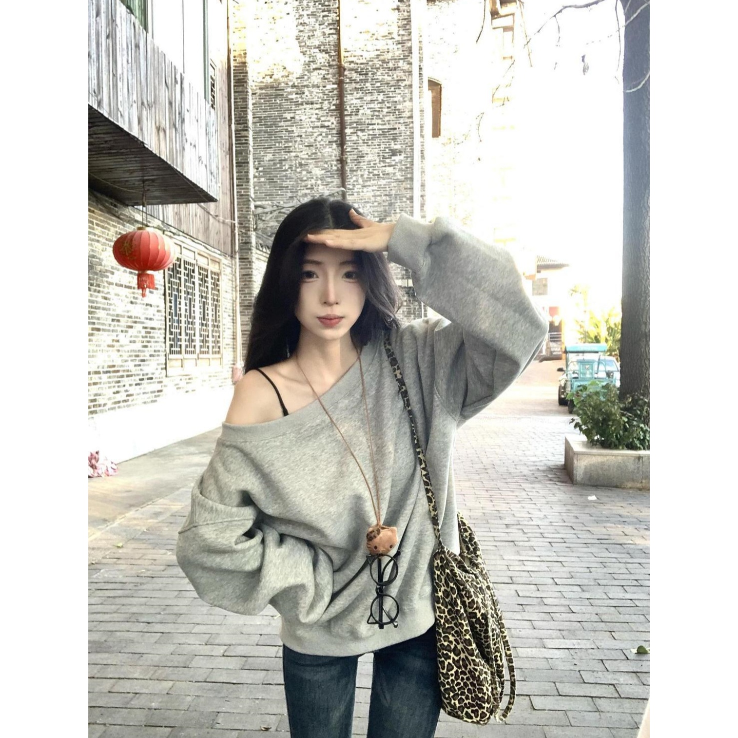 2025秋冬新款 复古感百搭浅灰色辣妹露肩上衣 学院风斜领卫衣女美式
