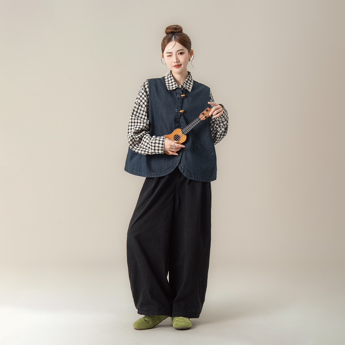 百搭上衣 宽松显瘦无袖 蓝色日系复古牛仔牛角扣马甲背心女秋季 新款