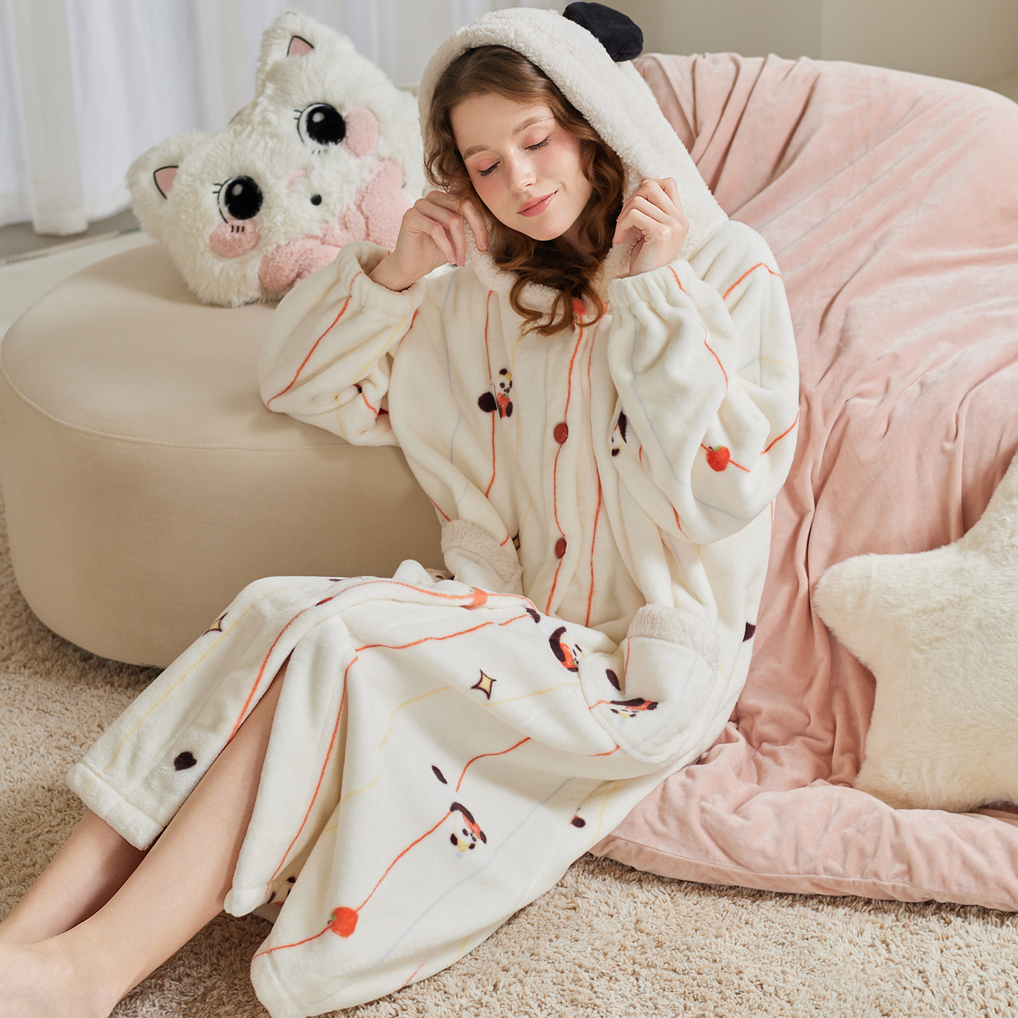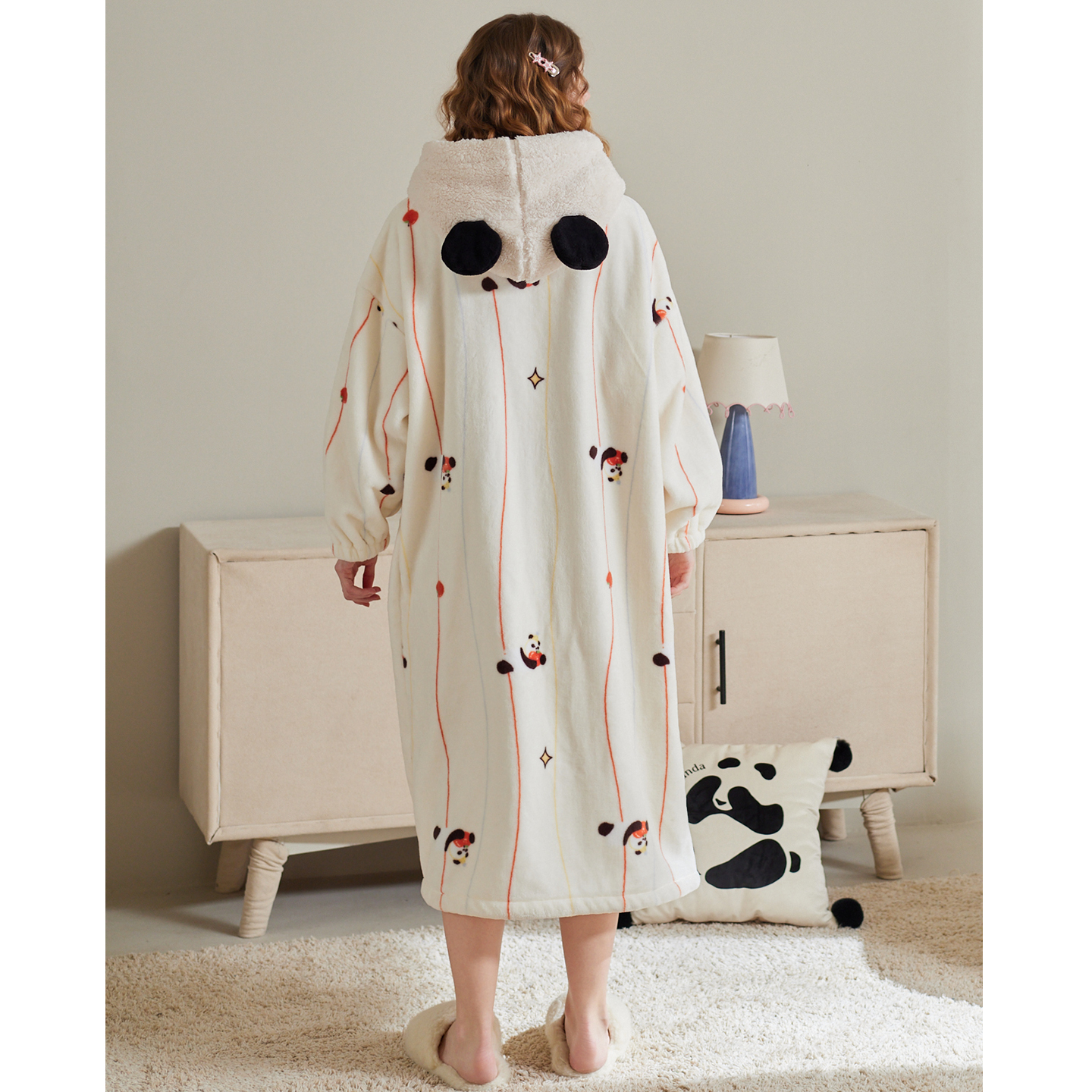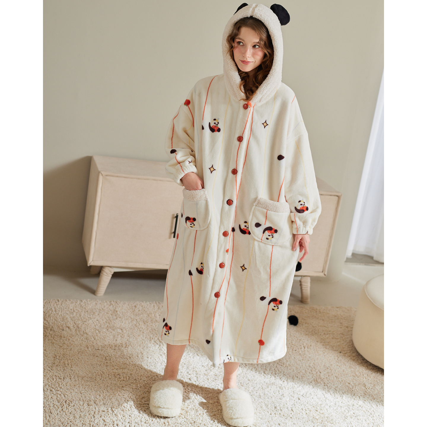 芬腾女士睡袍秋冬季 加绒加厚抗静电熊猫家居服 珊瑚绒连帽睡衣女款