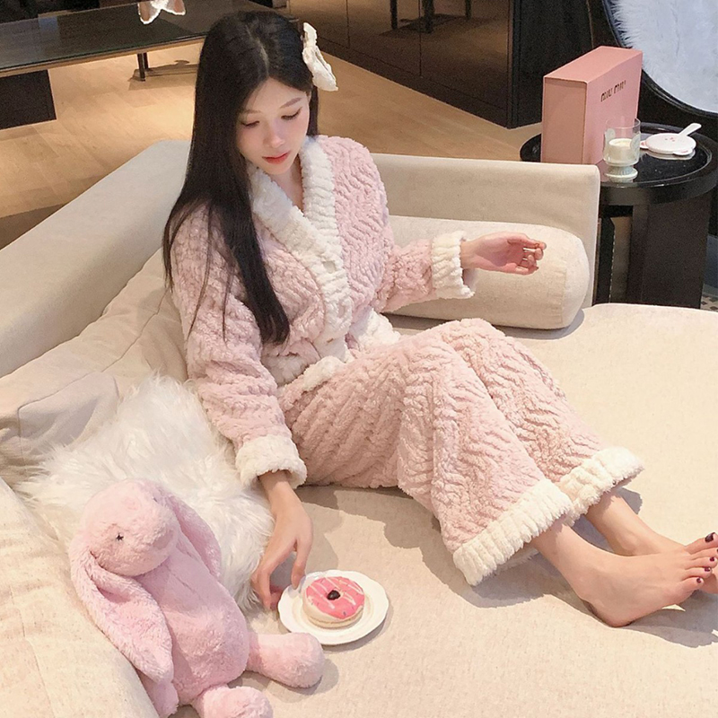 睡衣女秋冬季 加绒加厚家居服套装 海岛绒长袖 V领开衫 长裤 2025新款