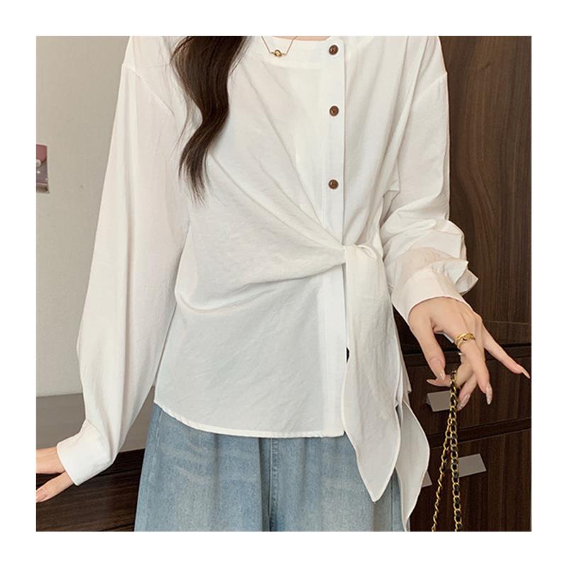 设计感蓝色长袖 大码 衬衫 2025新款 胖mm宽松小众绑带正肩 女秋装 新品