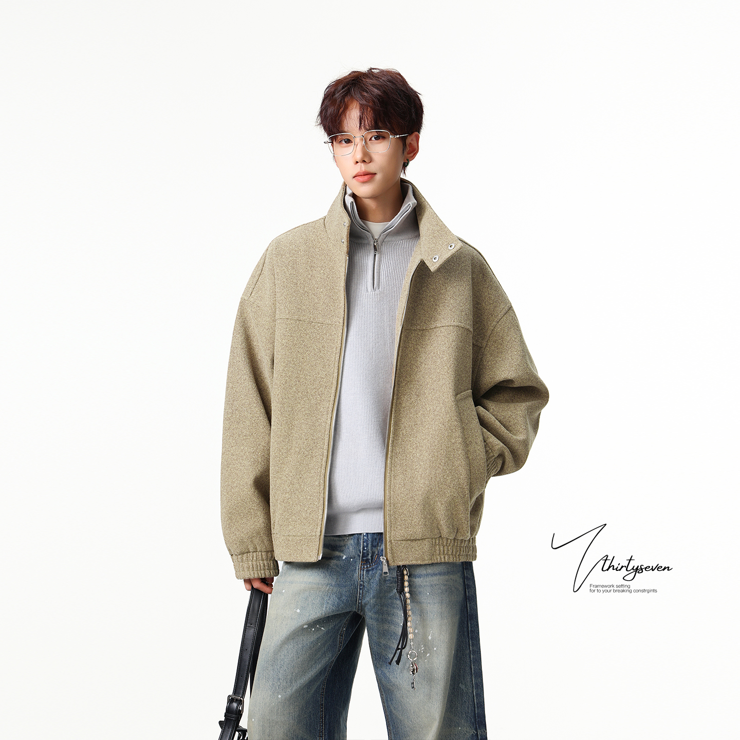 休闲外套 高街cleanfit短款 V37美式 复古深灰色立领毛呢夹克男秋季