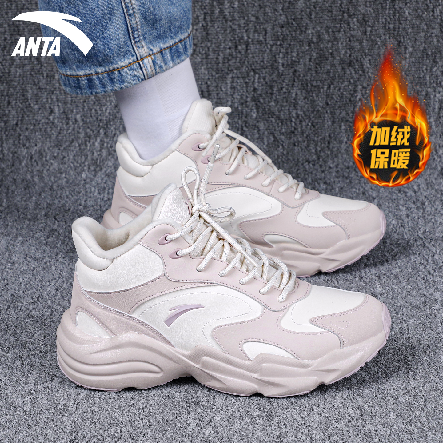 皮面防泼水雪地靴高帮运动鞋 安踏女鞋 2025新款 加绒保暖冬季 二棉鞋
