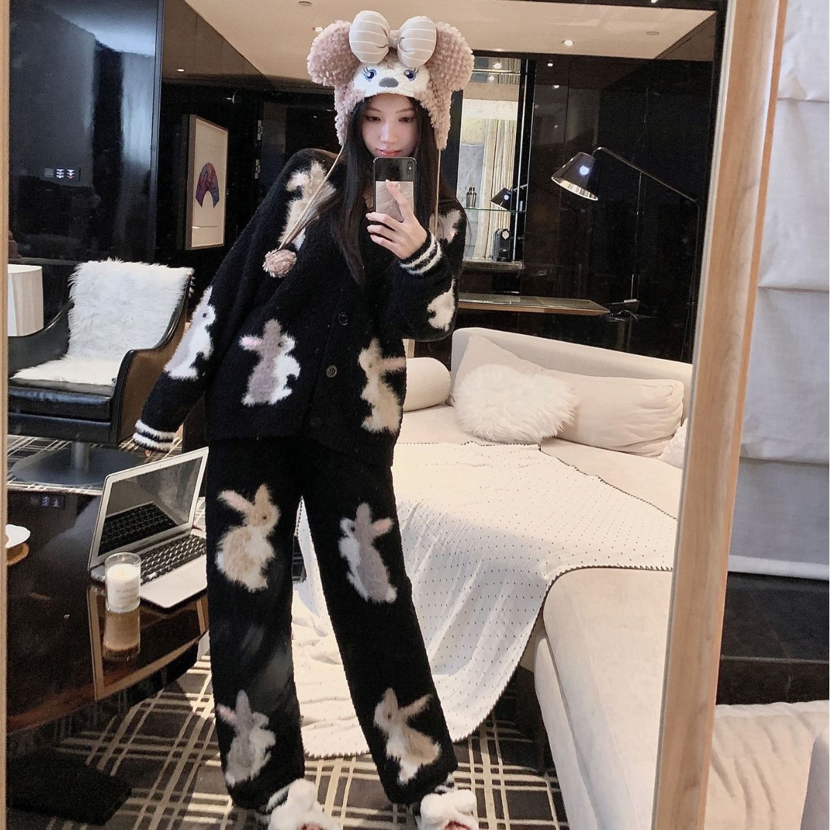 秋冬日系软绵绵可爱小兔子女士开衫 毛绒家居服 保暖半边绒睡衣套装
