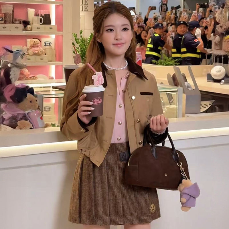赵露思同款 复古美拉德上衣潮 卡其色加绒翻领短外套女2025秋冬新款