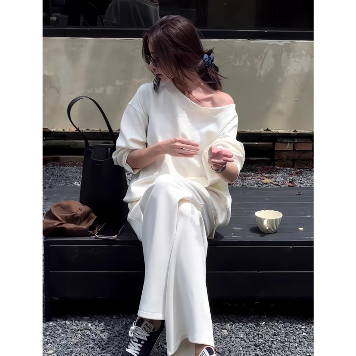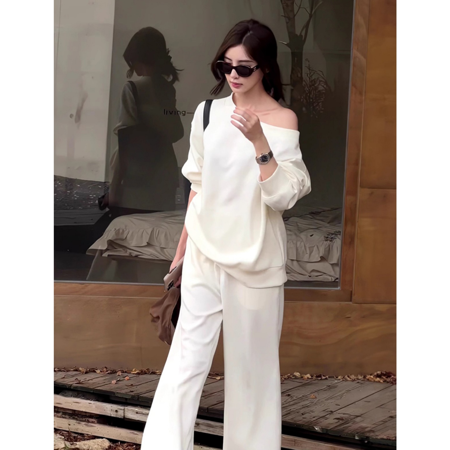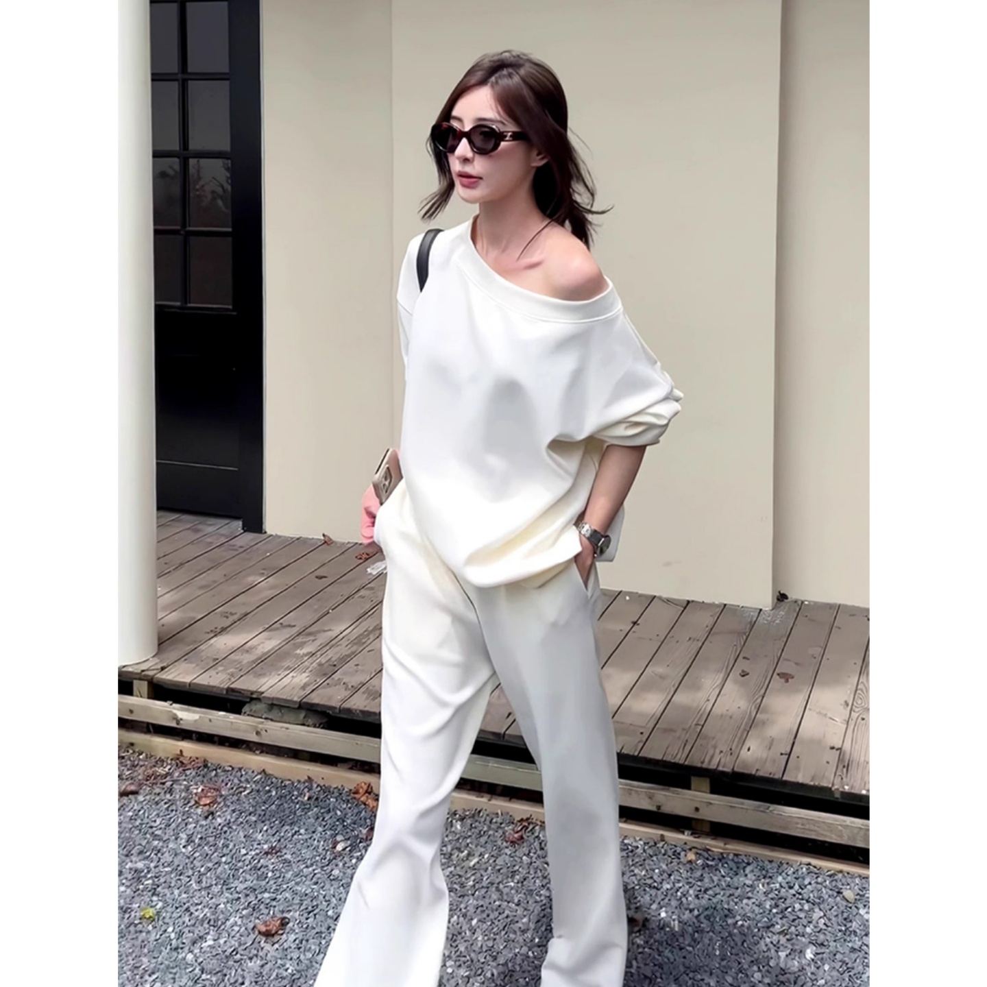 白色露肩斜领卫衣女秋季 一字漏肩绝美显瘦上衣早秋 宽松慵懒风长袖