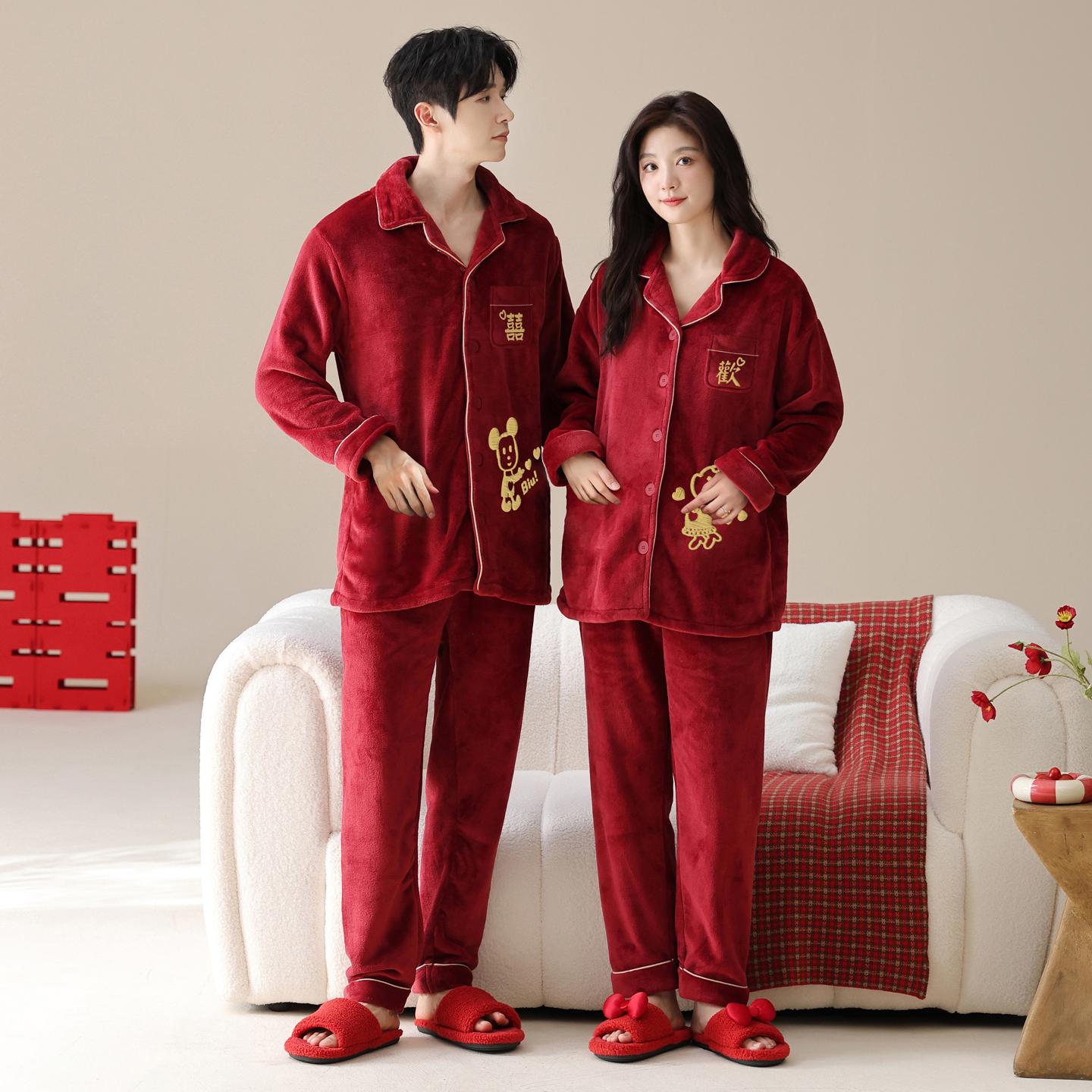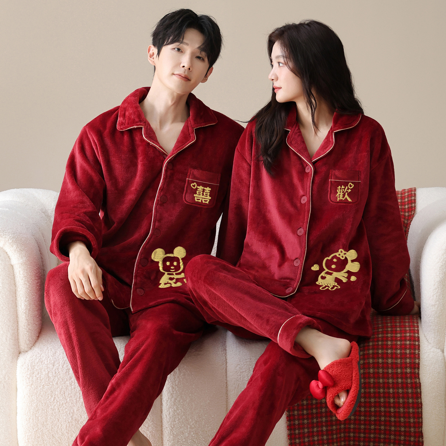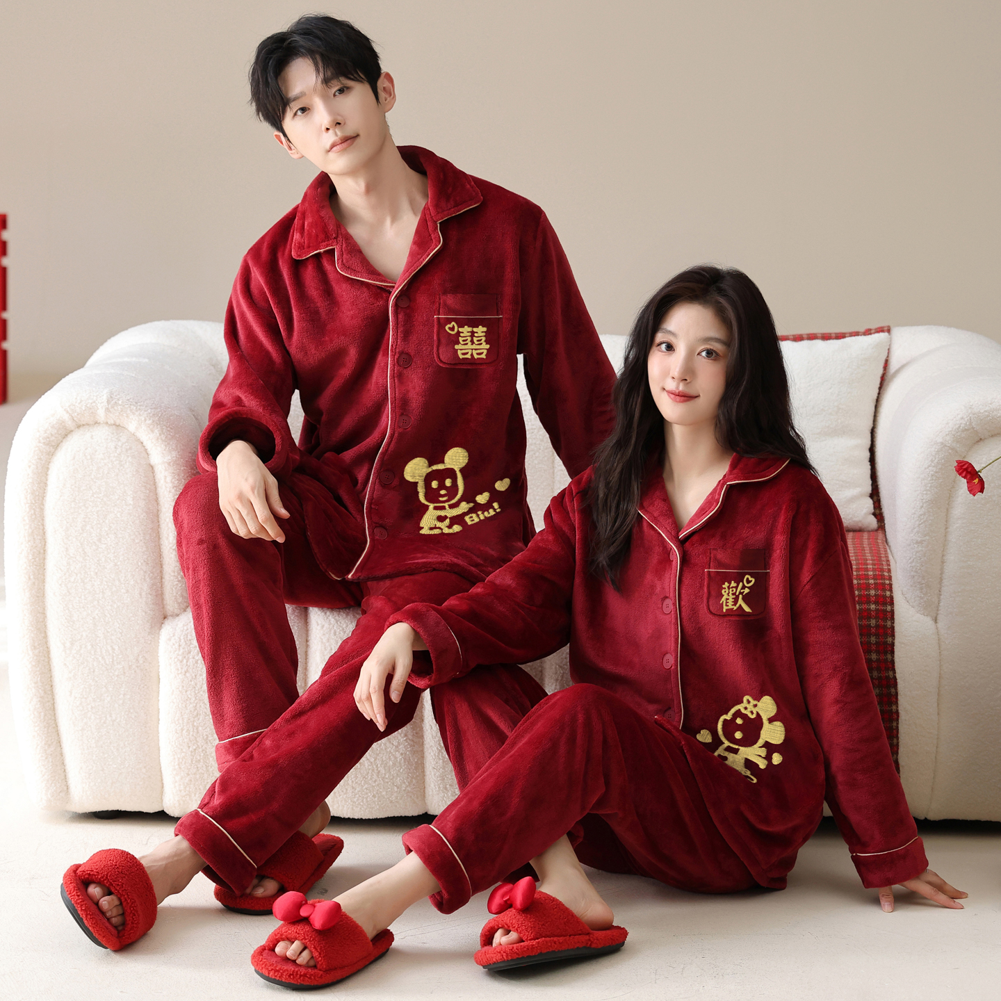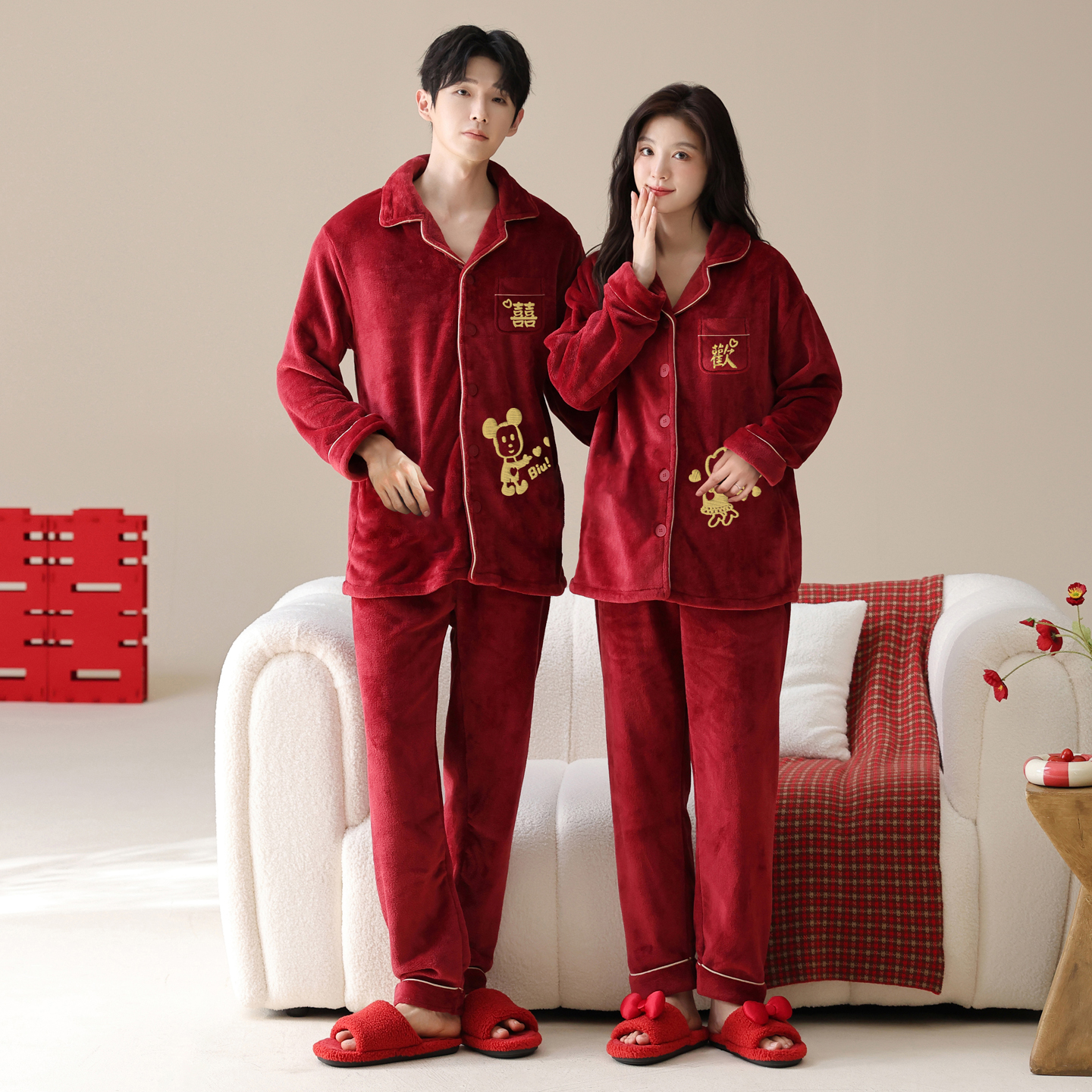 一男一女 相伴情侣装 乐姿梦睡衣结婚新婚套装 冬天红色珊瑚绒秋冬季