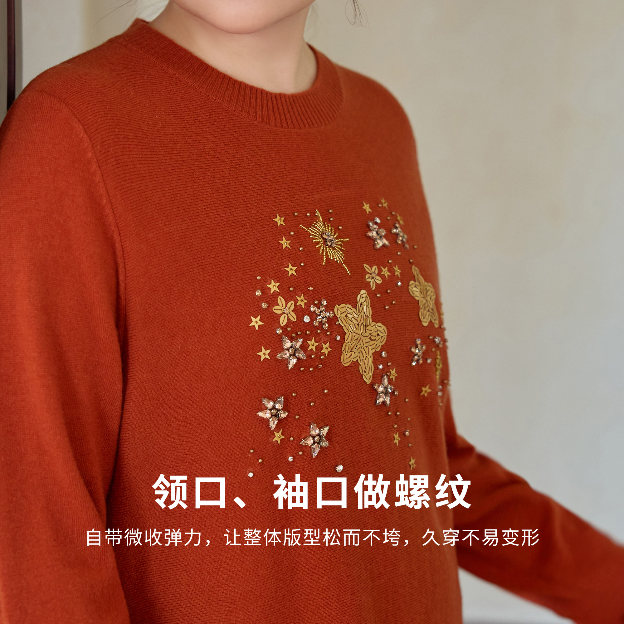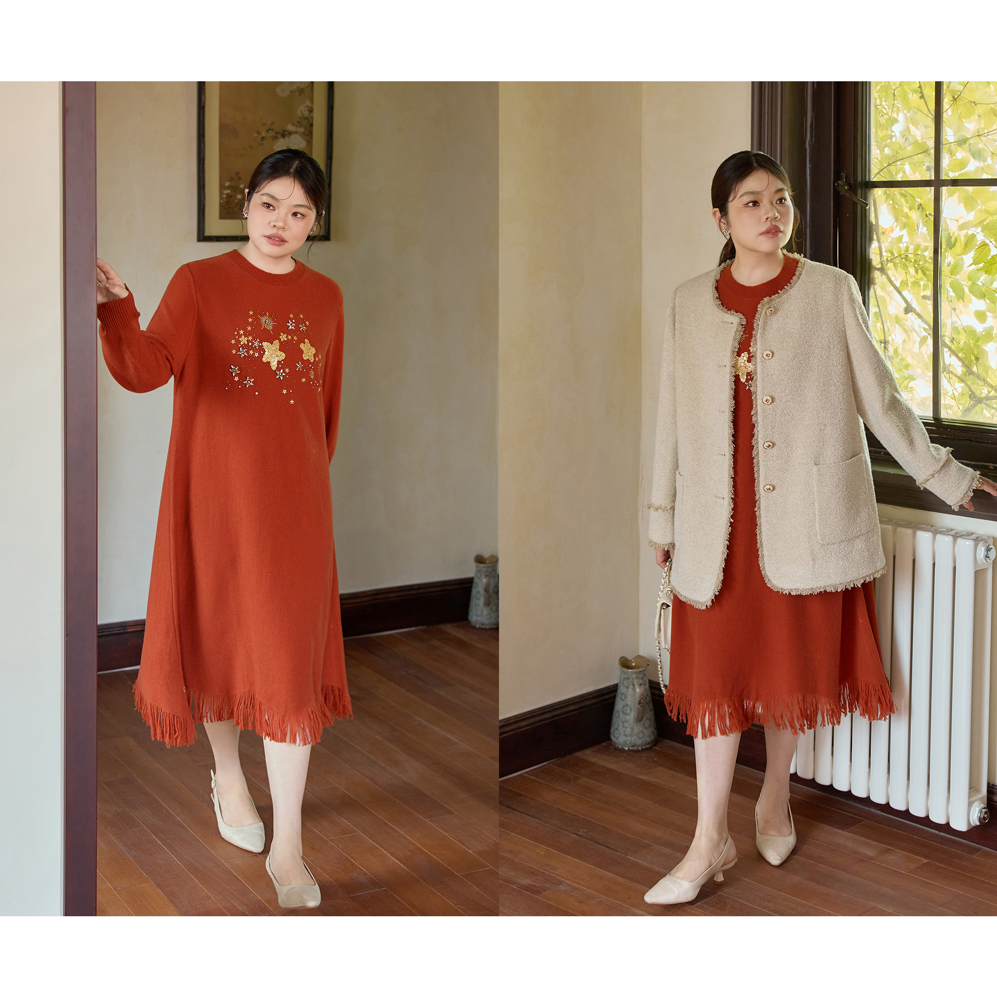 秋新款 女装 美丽客栈大码 圆领针织连衣裙女胖mm显瘦 100绵羊毛