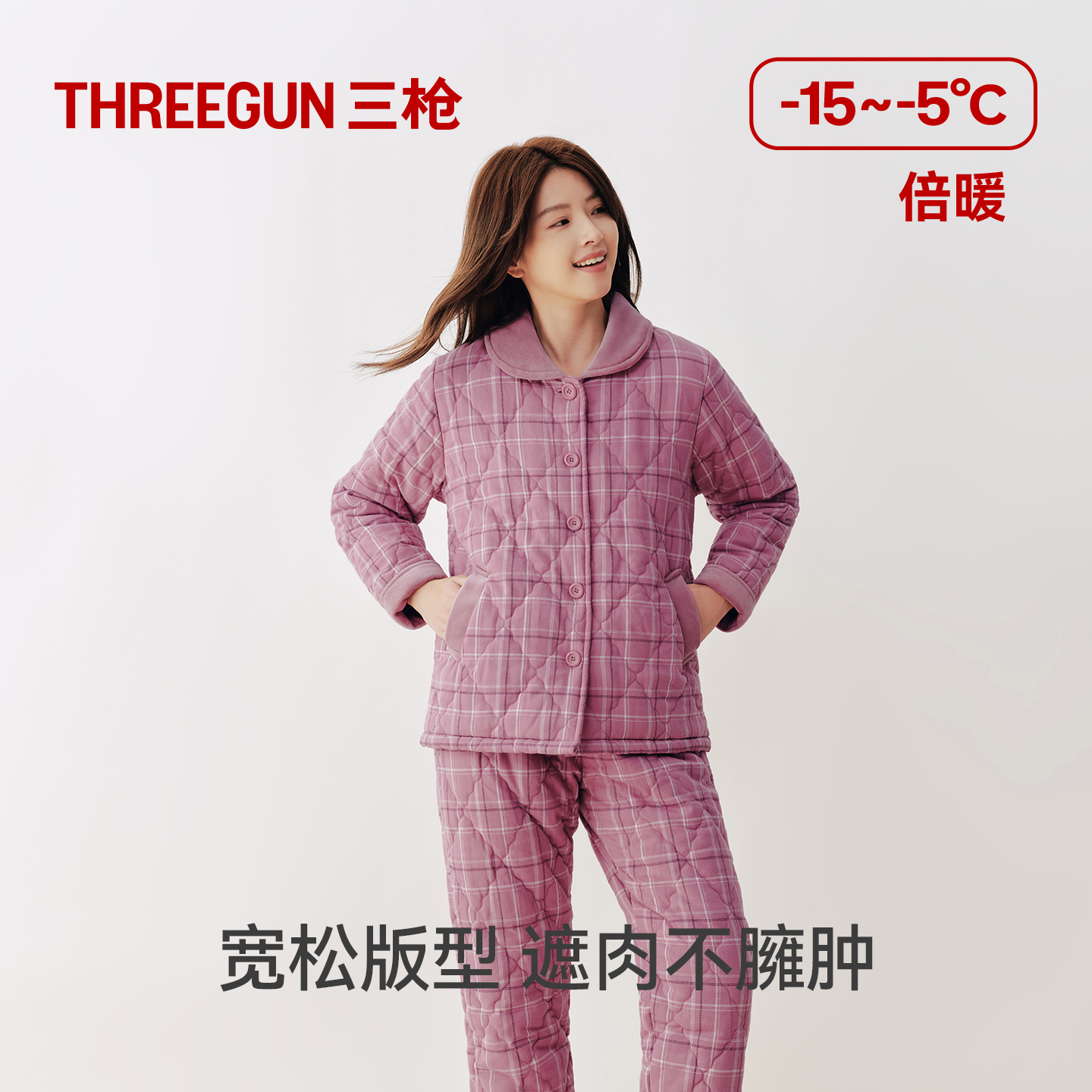 三枪秋冬新款 三层夹棉加绒纯棉情侣睡衣加厚格纹超柔软家居服套装