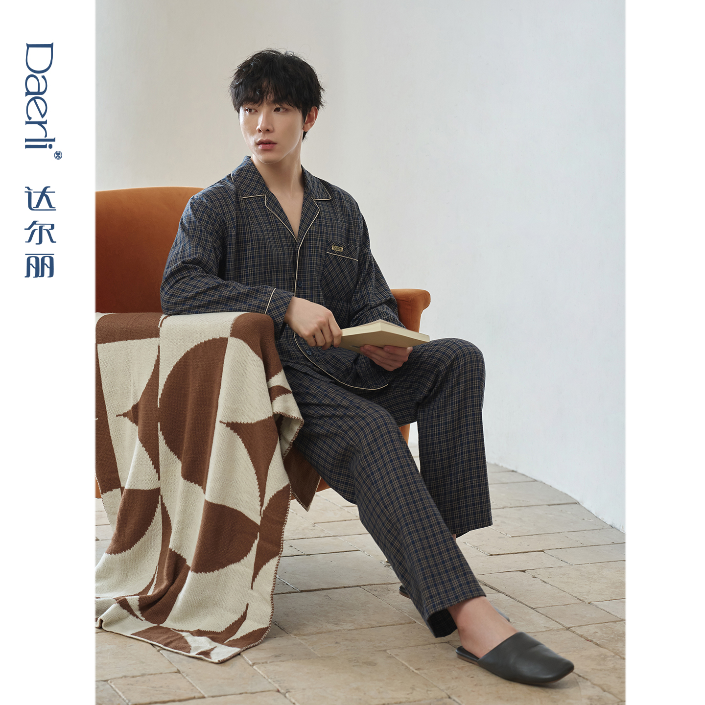 套装 达尔丽柔软长袖 家居服厚款 休闲格子开衫 睡衣男纯棉2025新款