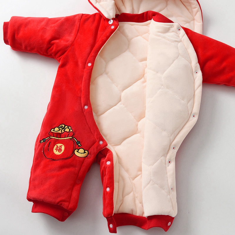 新生婴儿衣服秋冬加厚加绒红色冬装 宝宝连体衣龙年满月外出服冬季