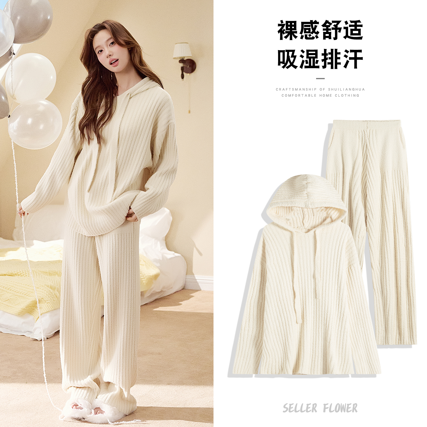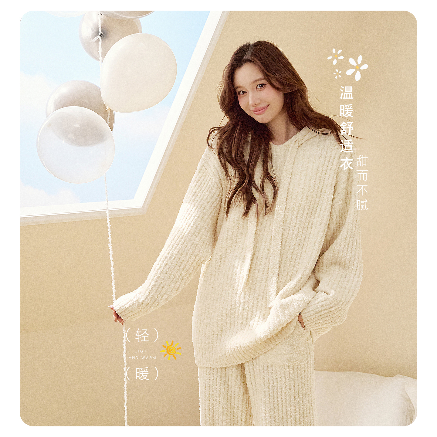 家居服507844 柔软长袖 三福女冬季 蝴蝶结抗静电海岛绒睡衣套装