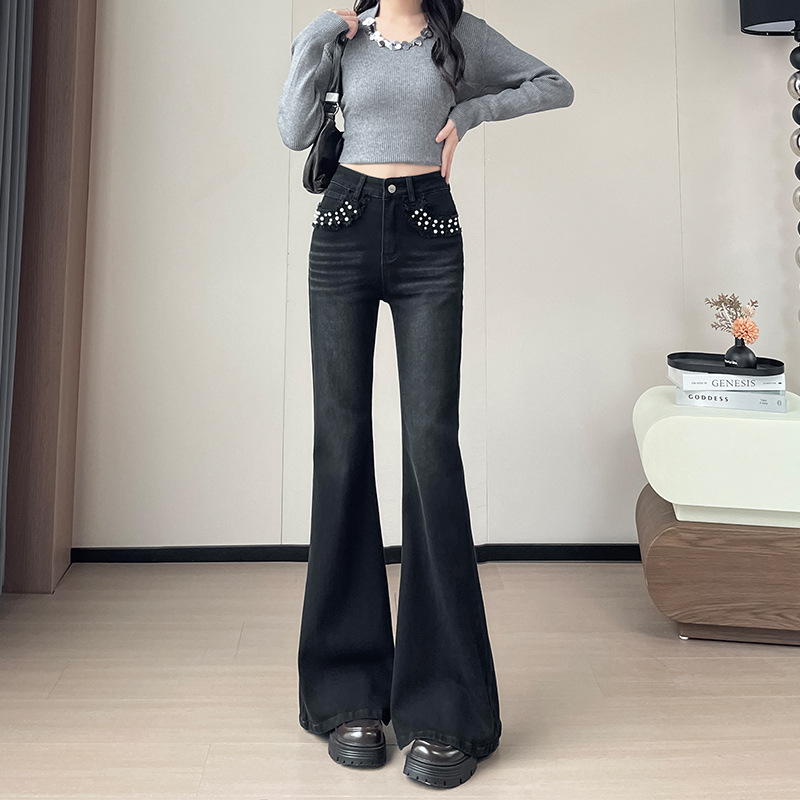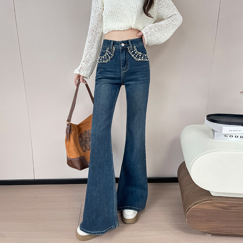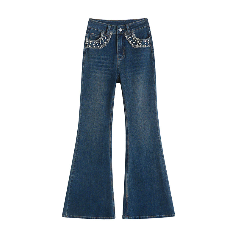 显瘦牛仔裤 钉珠毛边复古辣妹喇叭裤 微弹百搭修身 秋冬季 子 女长裤