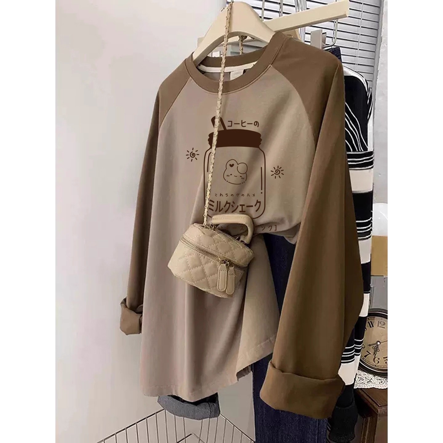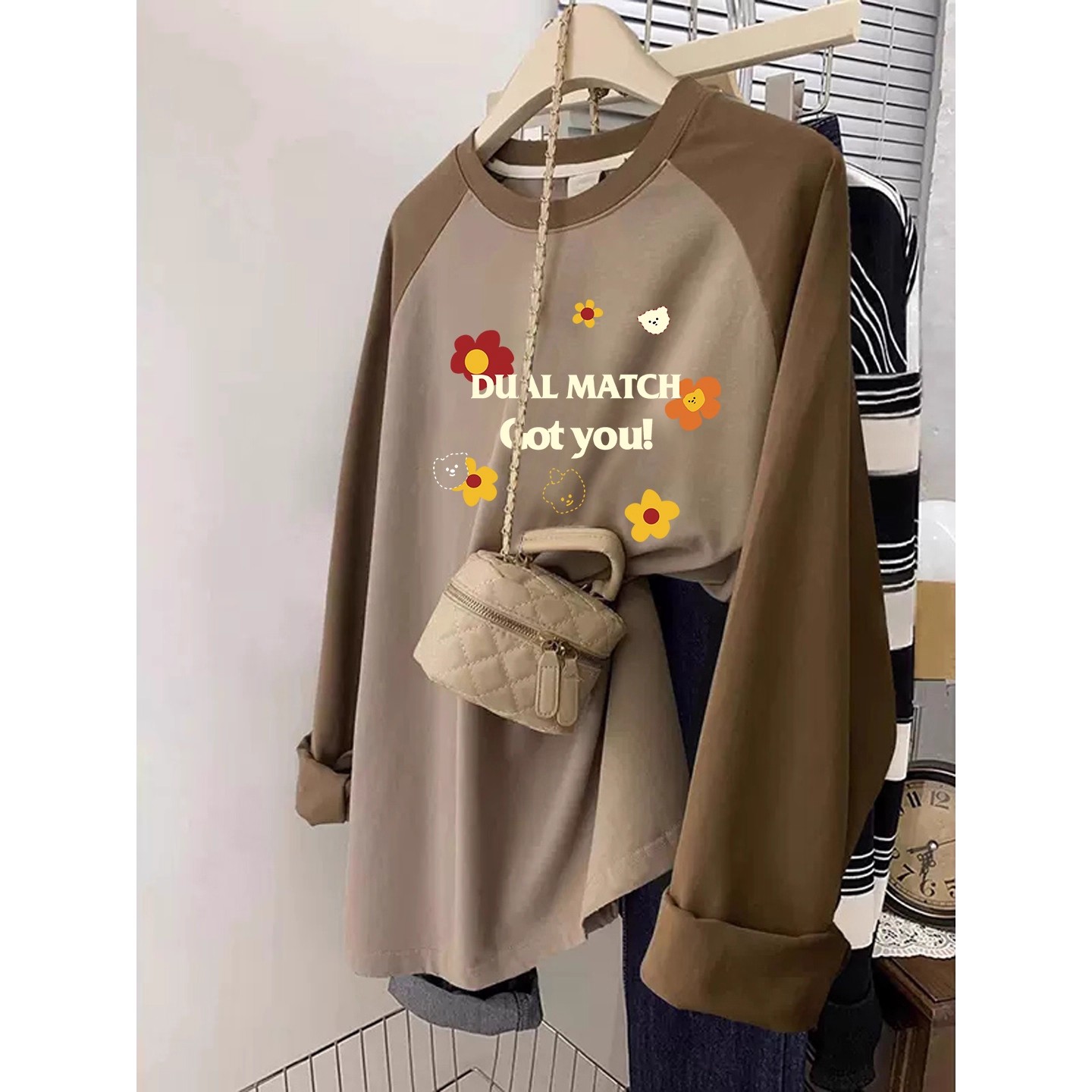 t恤女休闲oversize宽松拼接上衣打底衫 插肩纯棉长袖 胖mm秋季 大码