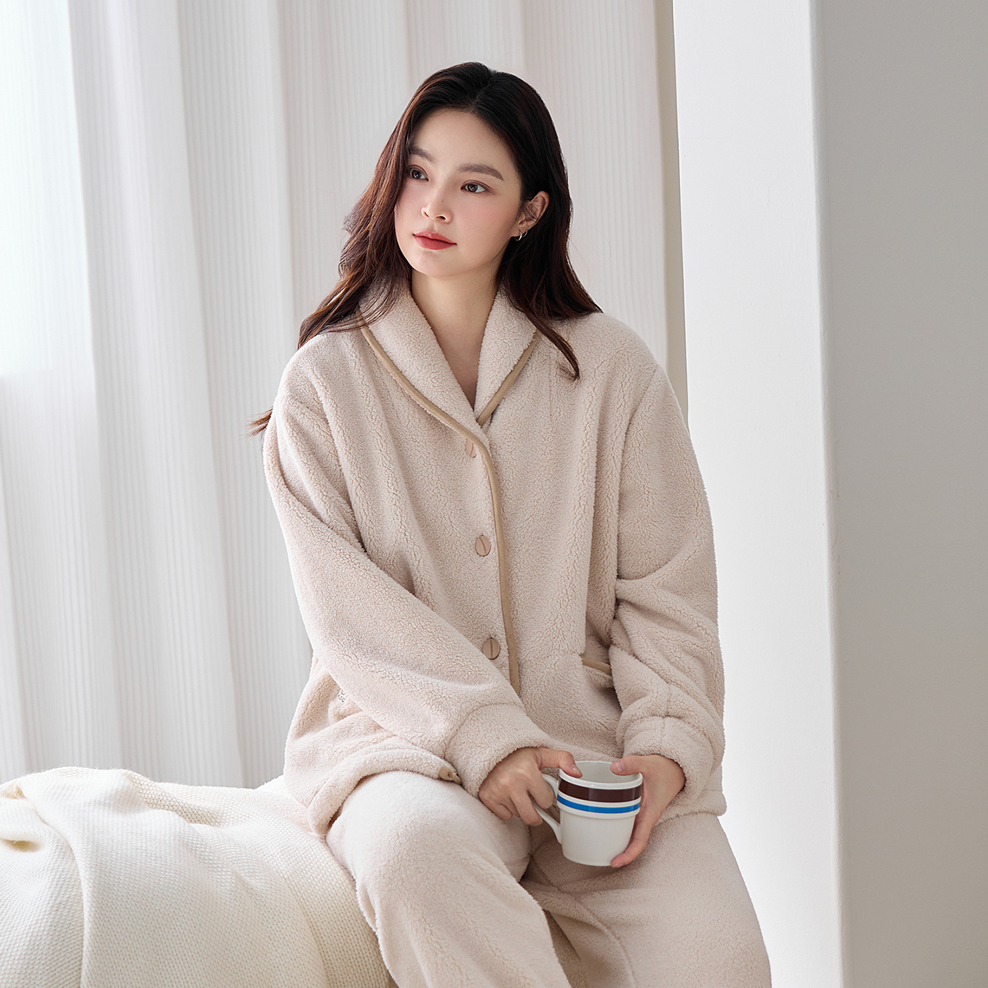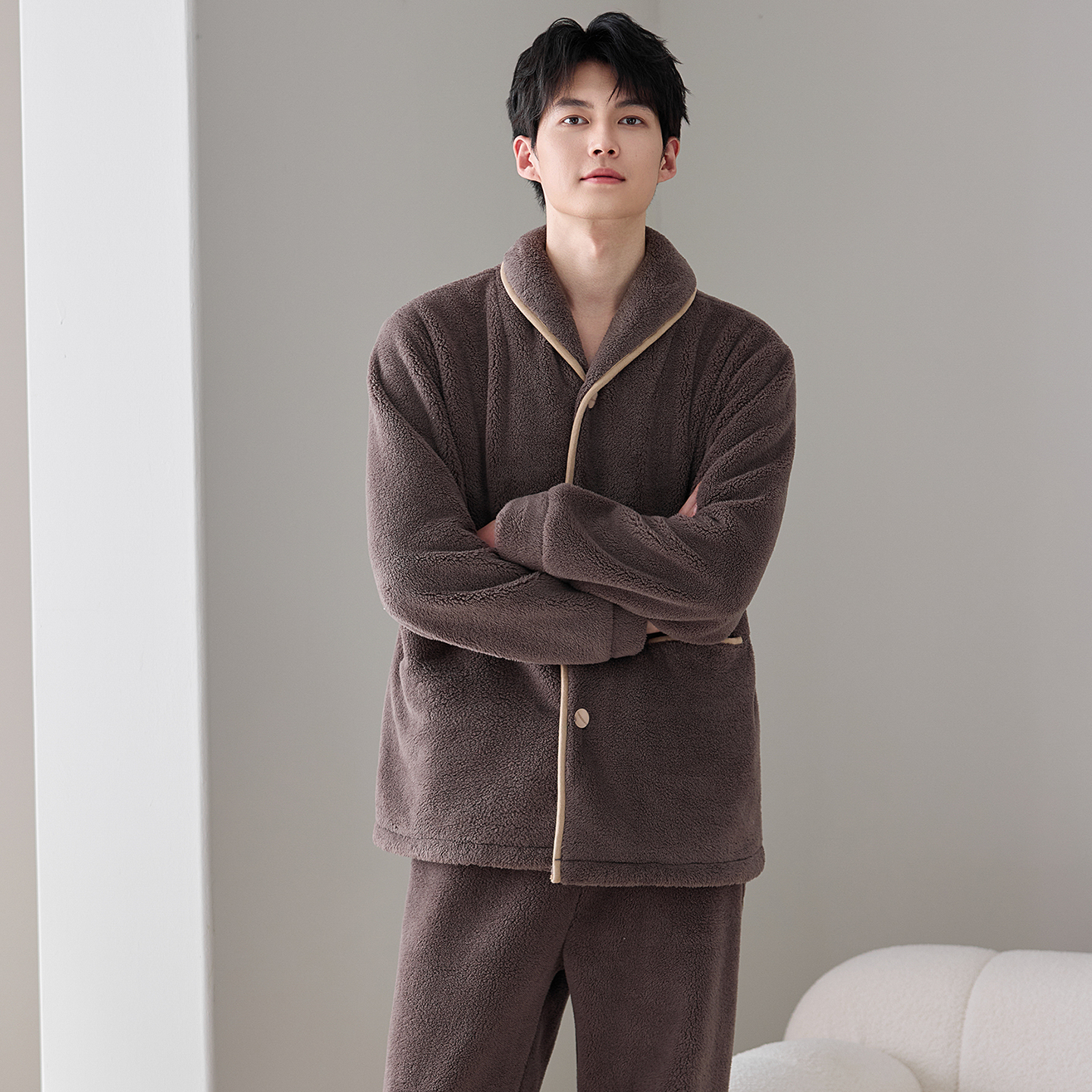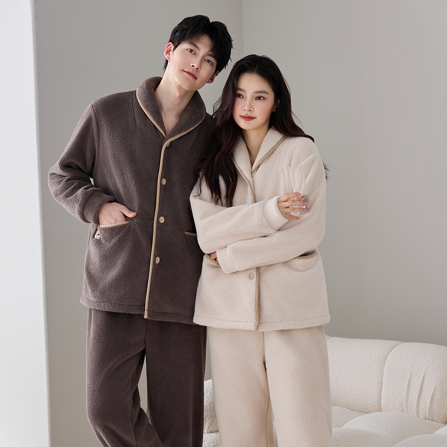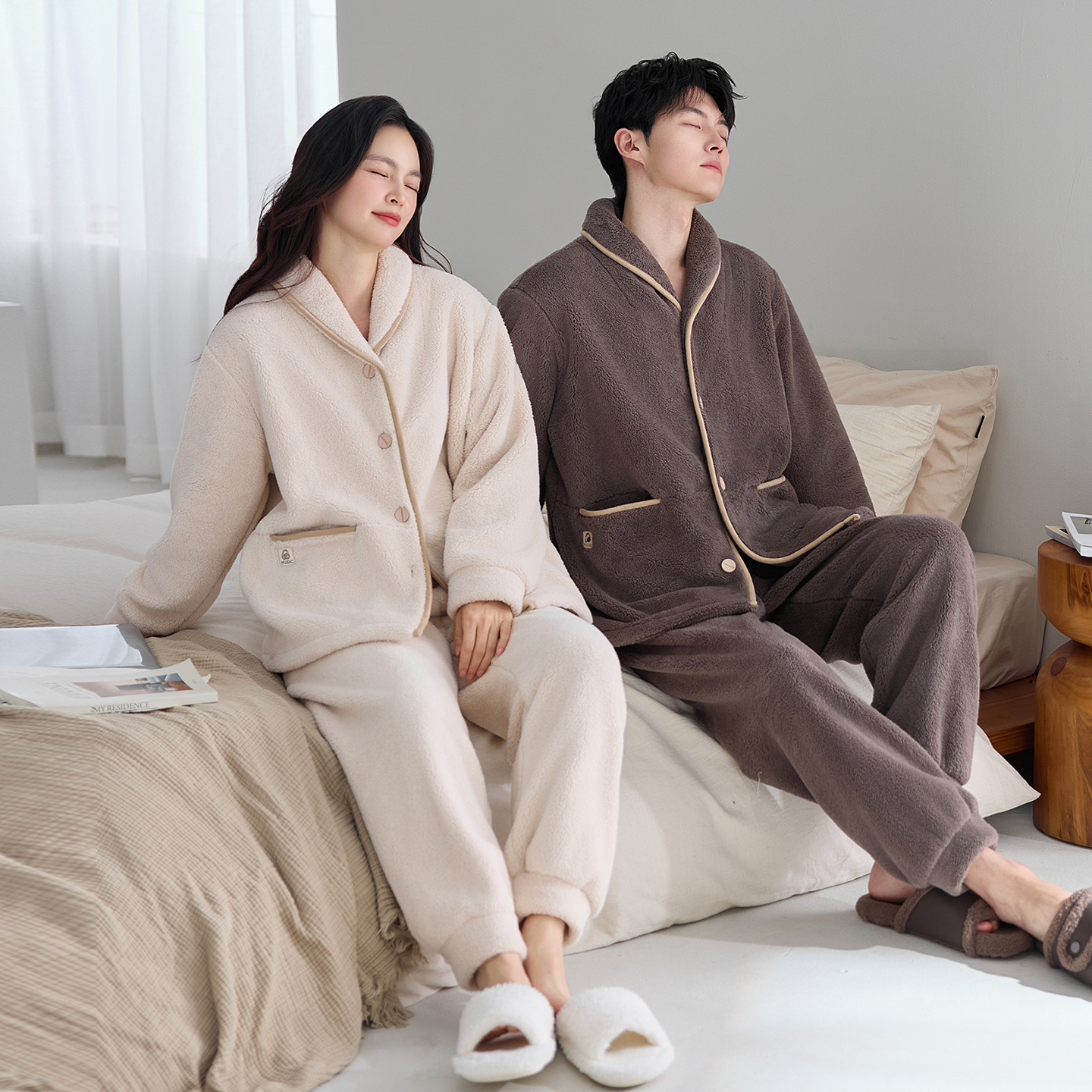 睡衣加绒加厚秋冬翻领珊瑚绒家居服套装 新一步情侣款 蛋白绒开衫
