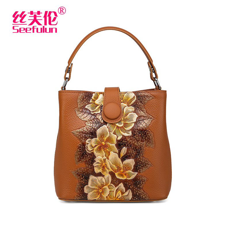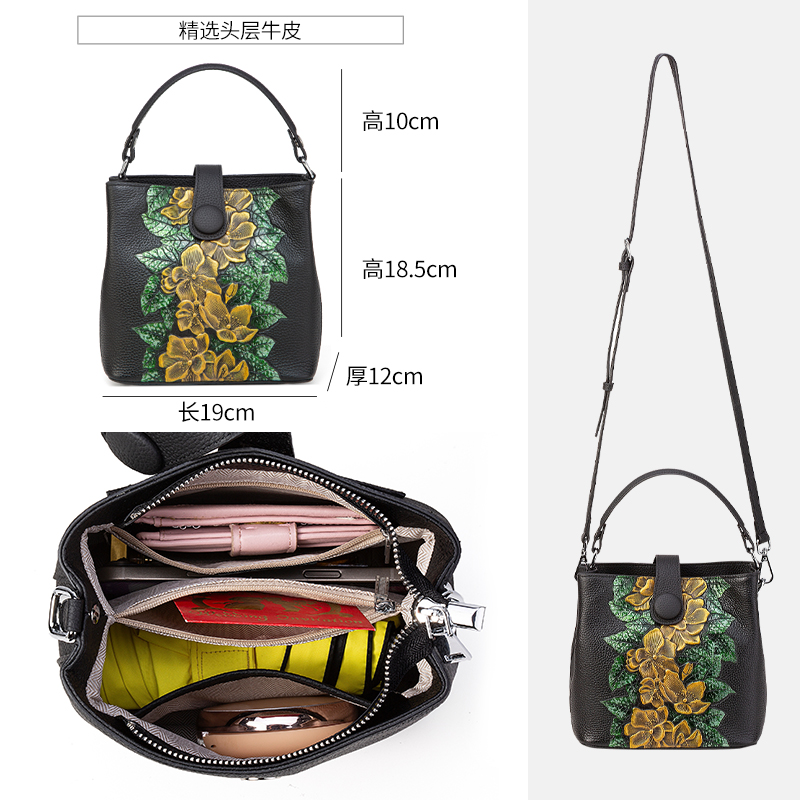 原创新款 牛皮立体压花手提小包包水桶包中国风休闲女包单肩斜挎包