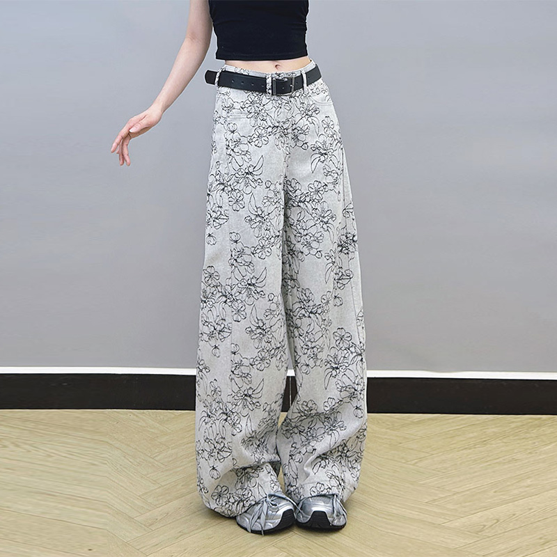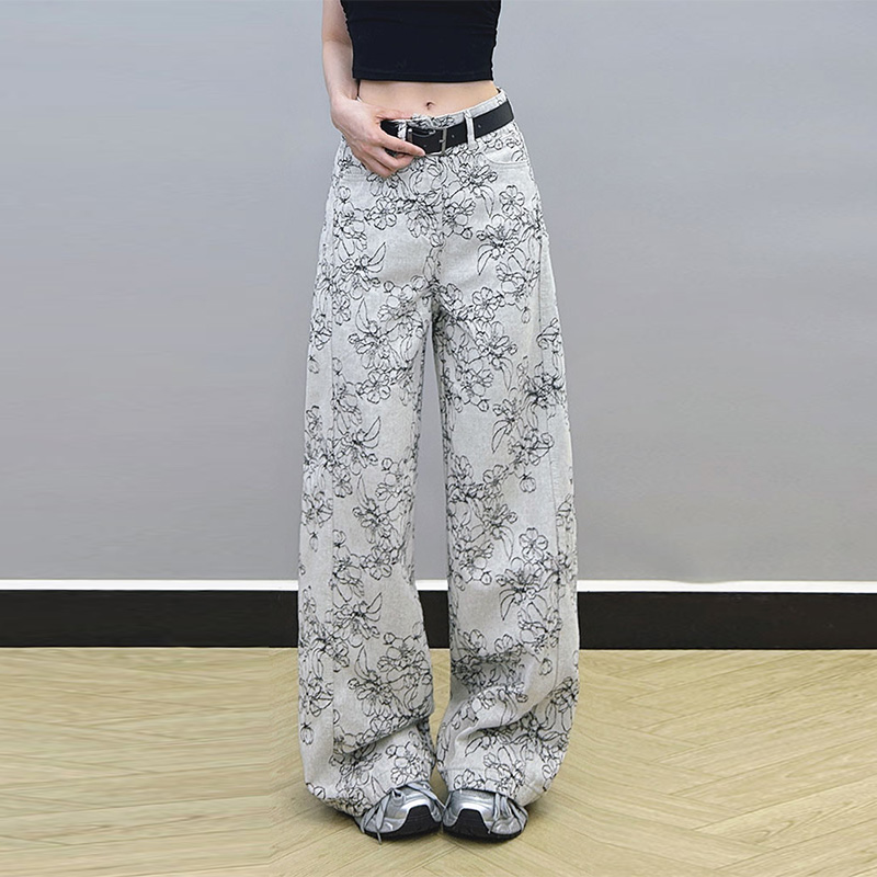 气质休闲百搭阔腿裤 新款 女2025秋季 设计感提花高腰牛仔裤