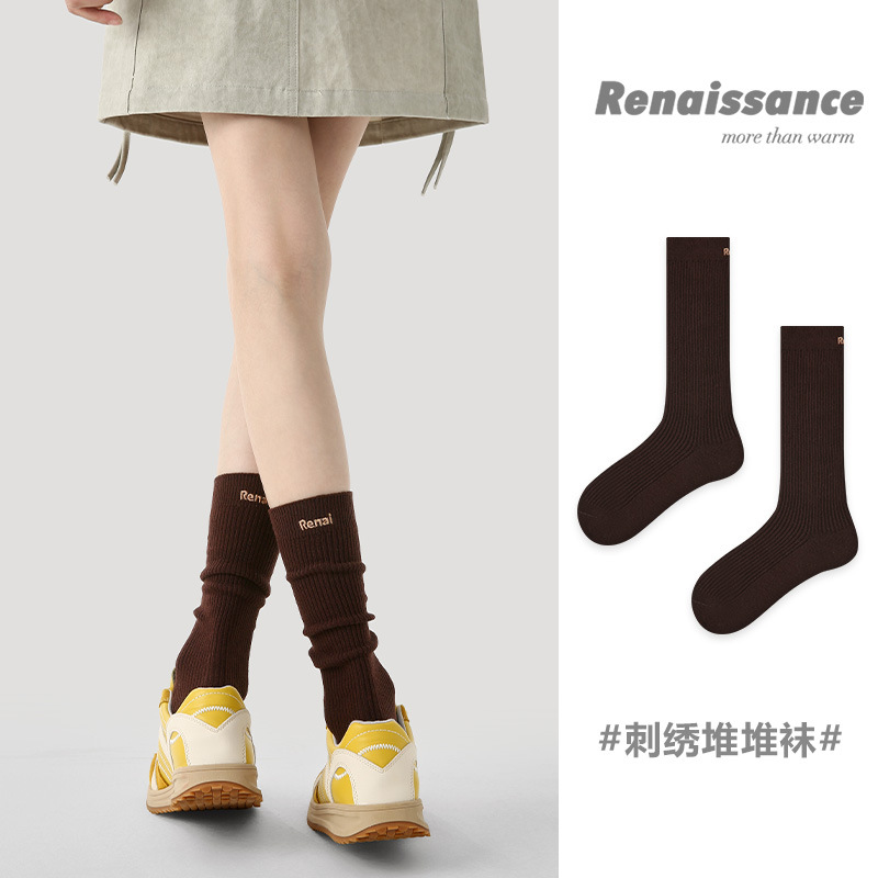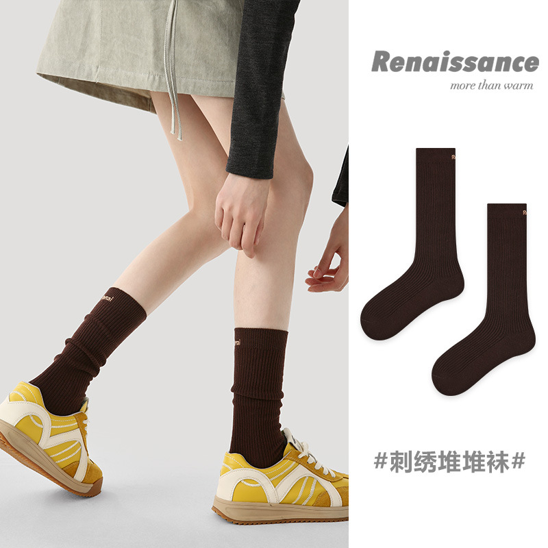 2025秋冬季 中筒袜纯色双针堆堆袜刺绣少女风ins潮袜子女 秋冬新款