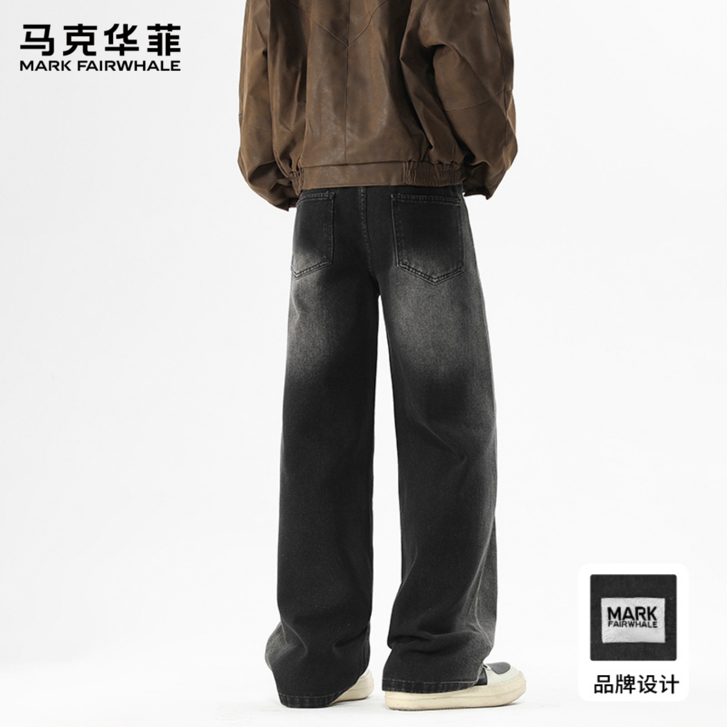 高街直筒拖地裤 V37美式 宽松休闲长裤 男秋季 子 复古浅色水洗牛仔裤