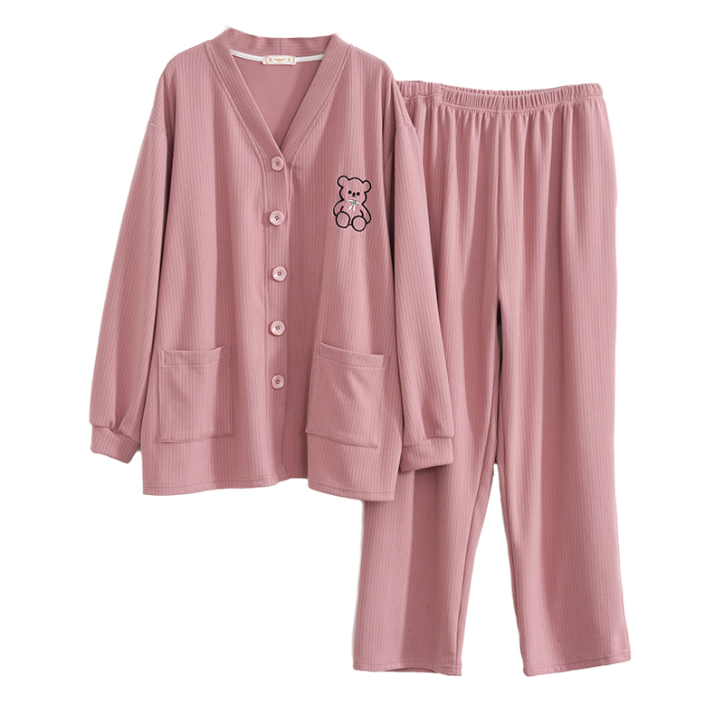 男春秋 带胸垫家居服套装 A类抗菌防螨纯棉情侣睡衣女长袖 红豆夏季