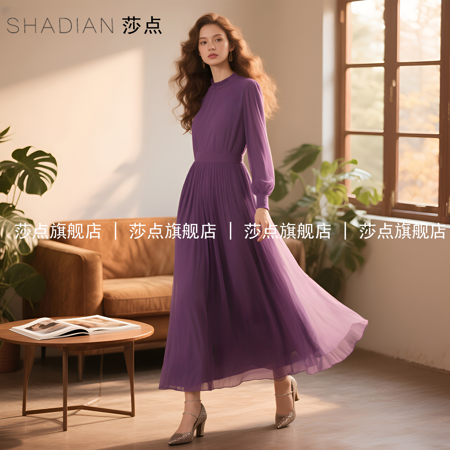 高级感 气质收腰度假风长裙长款 紫色连长袖 连衣裙女2025春秋新款